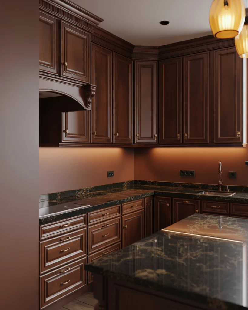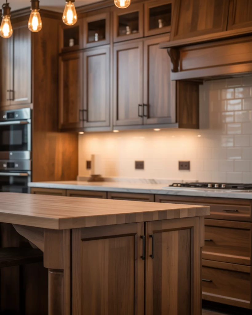 When you have brown cabinets (mid-tone through dark brown), painting walls a warm mocha or chocolate brown can unexpectedly lift up the space with a cocoon-like luxurious kitchen atmosphere. The color becomes part of the cabinetry narrative rather than mere background, so everything feels unified. This is extremely effective combined with light counters, metal hardware, and relaxed contemporary design. It’s a popular concept among those who are looking for depth and atmosphere.