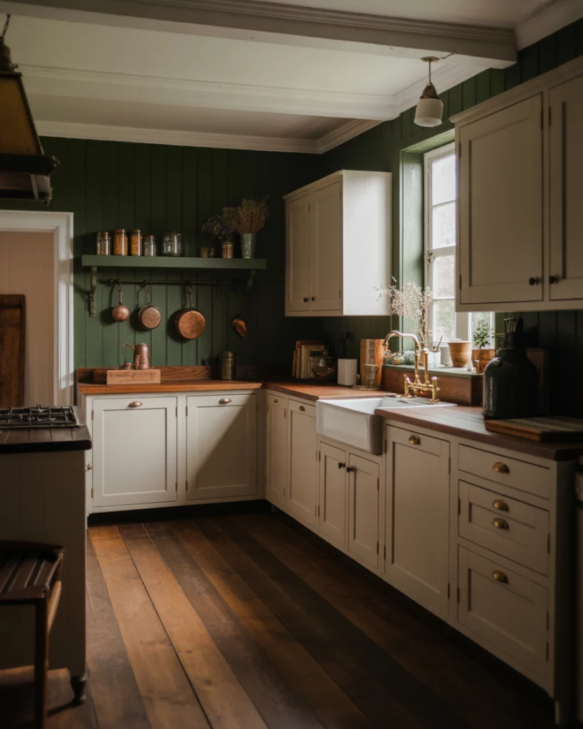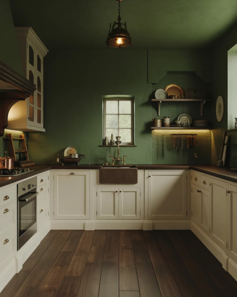 A moody yet refreshing choice for 2026 is forest green on the walls paired with white cabinets. The deep green shade provides a luxurious contrast that feels organic and bold at once. This palette works beautifully with dark wood floors or accents, evoking the elegance of English cottage kitchens. It’s one of the best schemes for homeowners who want to blend nature-inspired tones with crisp modern lines.