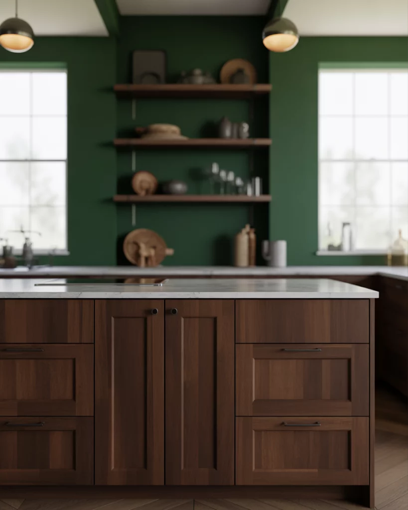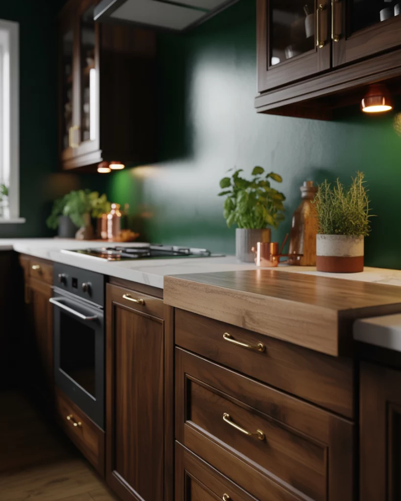 3. Deep Green Accent Wall With Dark Wood Cabinets