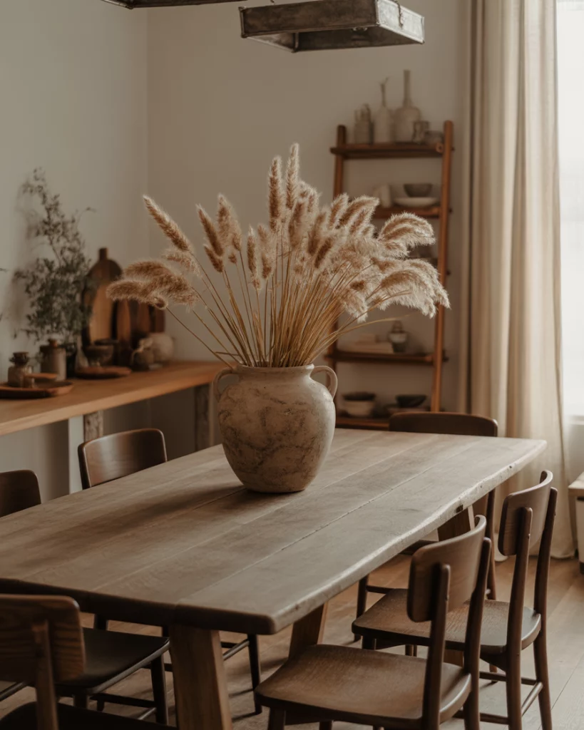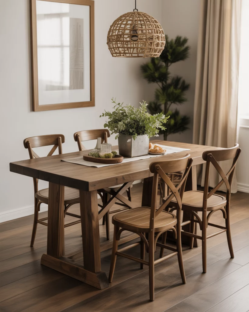 A timeless choice for 2026 is embracing a rustic look with wooden accents. Think brown tones, simple everyday centerpiece ideas, and cozy textures that make the table inviting for family meals. A small round or rectangle table feels especially warm when paired with a natural wood tray filled with candles, greenery, and seasonal fruit. This look fits perfectly with the modern farmhouse trend that continues to inspire American homes. Many stylists, like Joanna Gaines, suggest layering cute but practical items to create an approachable vibe.