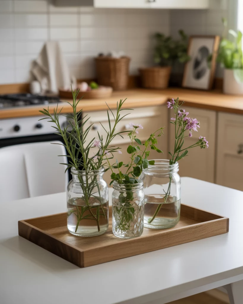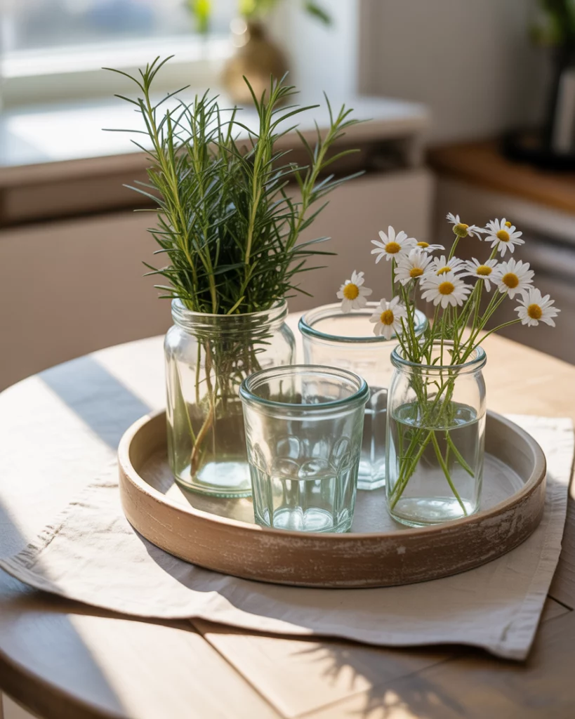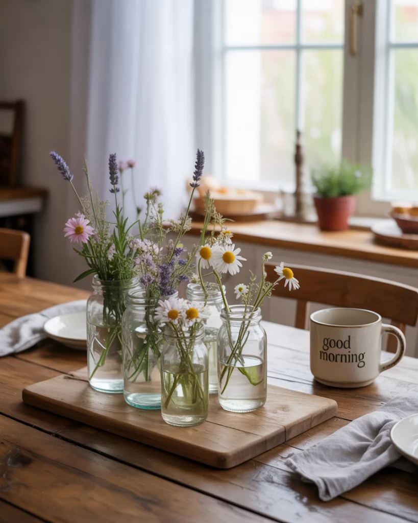 Sometimes everyday centerpiece ideas are about simplicity: a long row of bud vases on a rectangle table or a single small round tray on a round one. These cute arrangements make it easy to swap out flowers or greenery depending on the season. The key is keeping it approachable so the decor never feels in the way of actual meals. Many bloggers onDesignSpongehighlight that versatility is what makes everyday styling last.