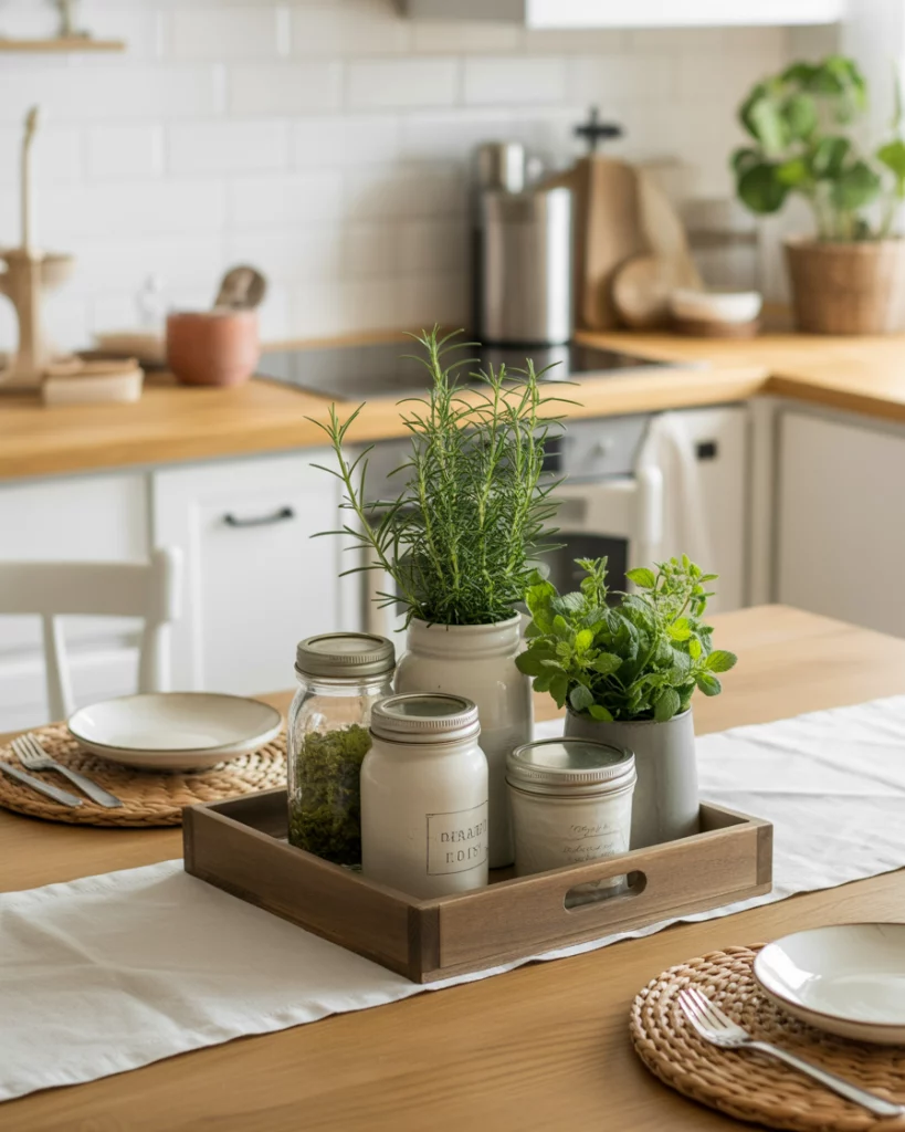 The modern farmhouse aesthetic remains a favorite in 2026, mixing rustic charm with modern lines. A rectangle table can hold a long wooden tray filled with cute herbs in jars, while a small round table might feature a single circle basket with seasonal accents. This approach feels casual yet thoughtful, making it one of the most practical everyday centerpiece ideas. AsMagnoliaexperts often note, this trend works because it celebrates lived-in beauty.