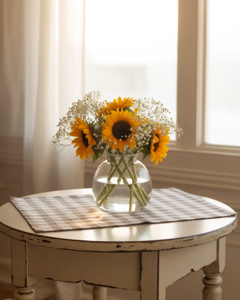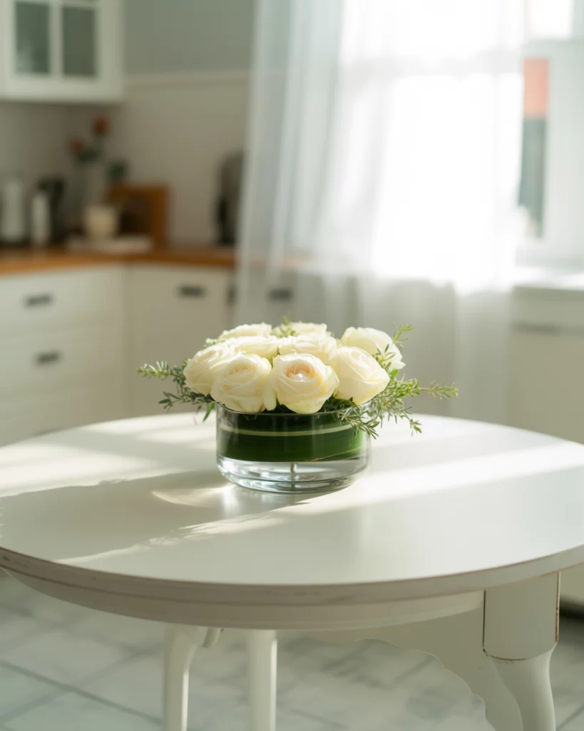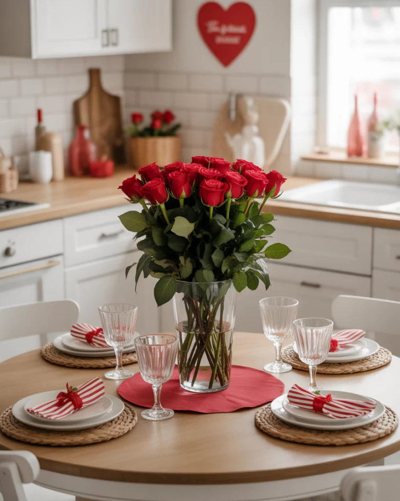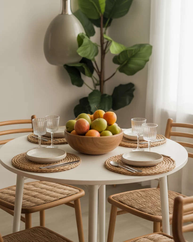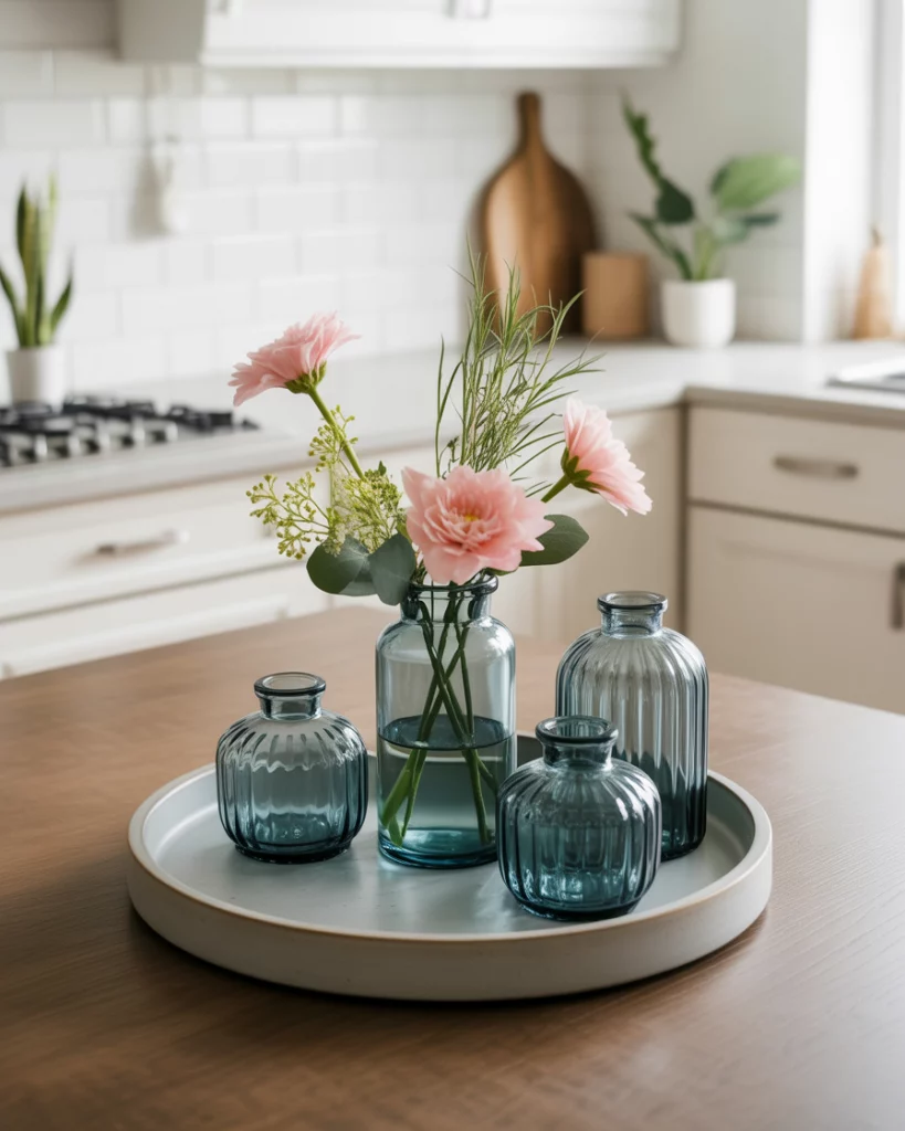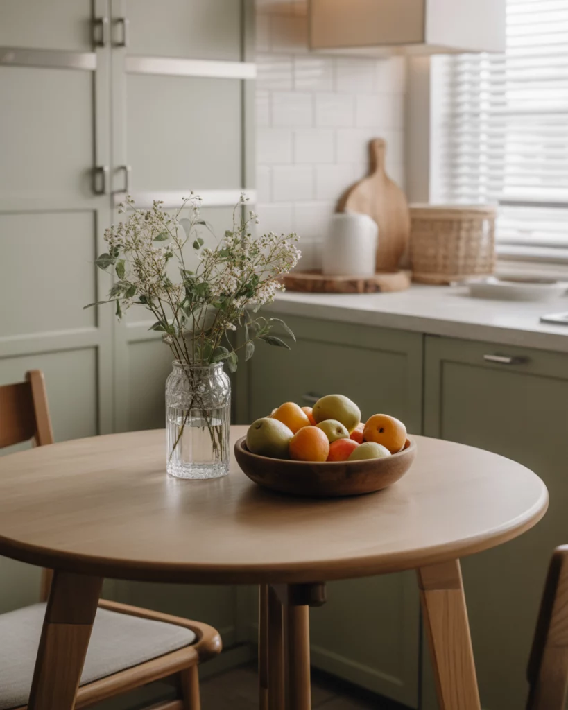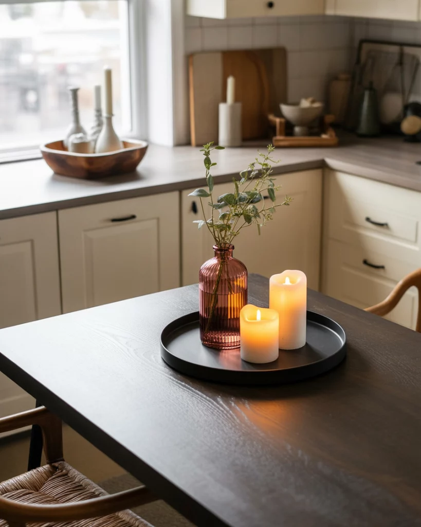 If you have a small round table, don’t underestimate its charm. A cute centerpiece like a glass vase of seasonal blooms or a rustic bowl of fruit makes it welcoming for everyday meals. The key is scale—keeping things compact so the table remains functional. In tight kitchens, stylists recommend choosing one bold object instead of many little ones. This creates both visual interest and practicality.