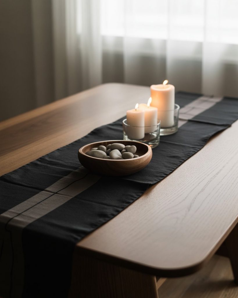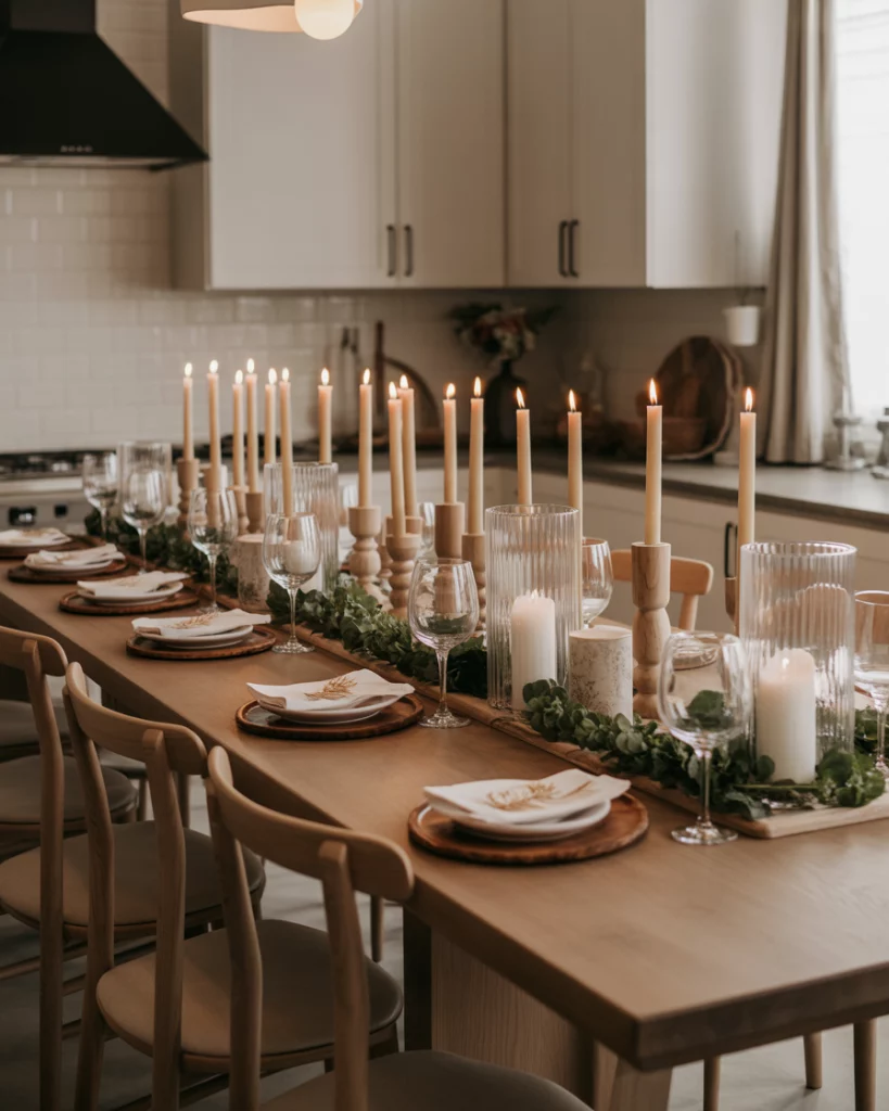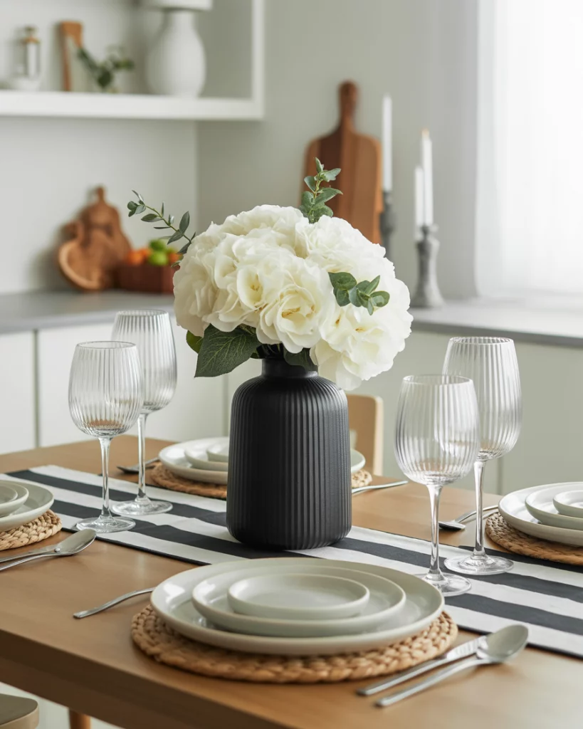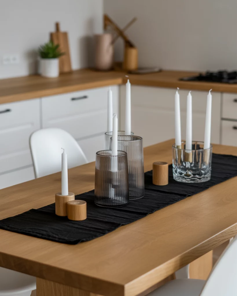 For a rectangle table, playing with modern contrasts works beautifully. A long black runner topped with white candles in glass holders makes the table instantly chic. Adding a hint of brown wood in trays or chargers warms up the look without losing sophistication. This balance between bold and soft tones is often used in modern farmhouse interiors featured onElle Decor.