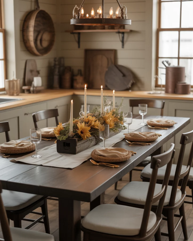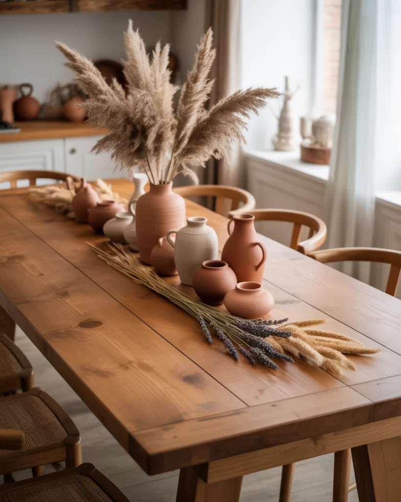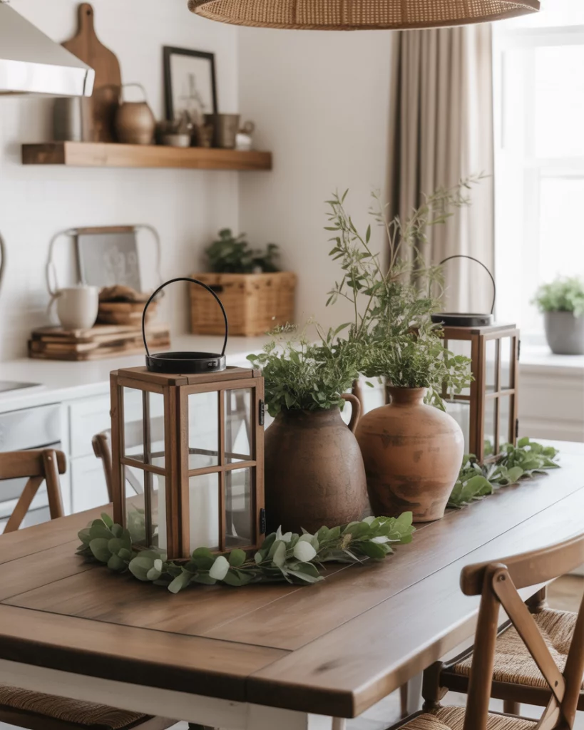 A long rectangle table becomes the perfect backdrop for a modern farmhouse centerpiece. Think wooden boards layered with brown pottery, cute plants, or rustic lanterns. This look makes family gatherings warm and inviting while still carrying a sense of design-forward style. According toCountry Living, mixing wood with everyday greenery keeps the look authentic and timeless.