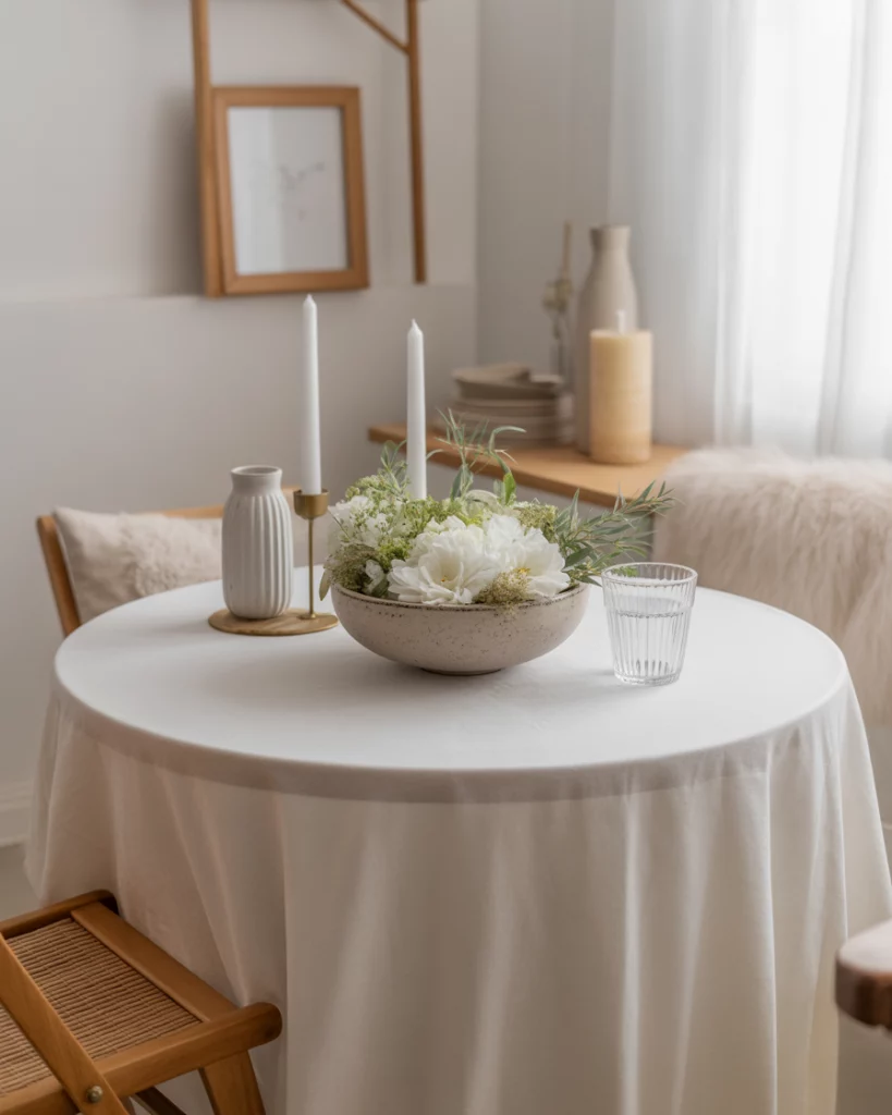 For those who prefer light, airy designs, a circle or round table styled in white tones creates calmness. A white ceramic bowl with floating flowers or candles works as a centerpiece everyday idea that feels clean yet welcoming. This style is often associated with Scandinavian decor, which emphasizes simplicity and harmony. Bloggers onNordic Designnote that white spaces encourage relaxation during meals.