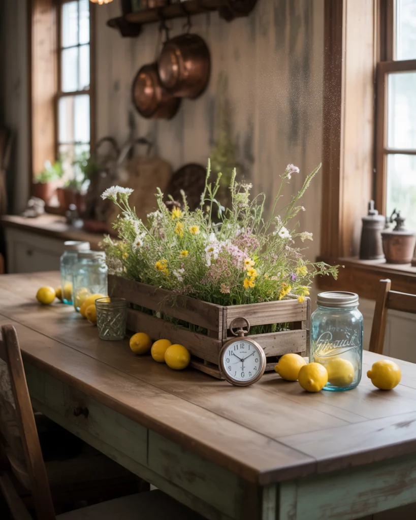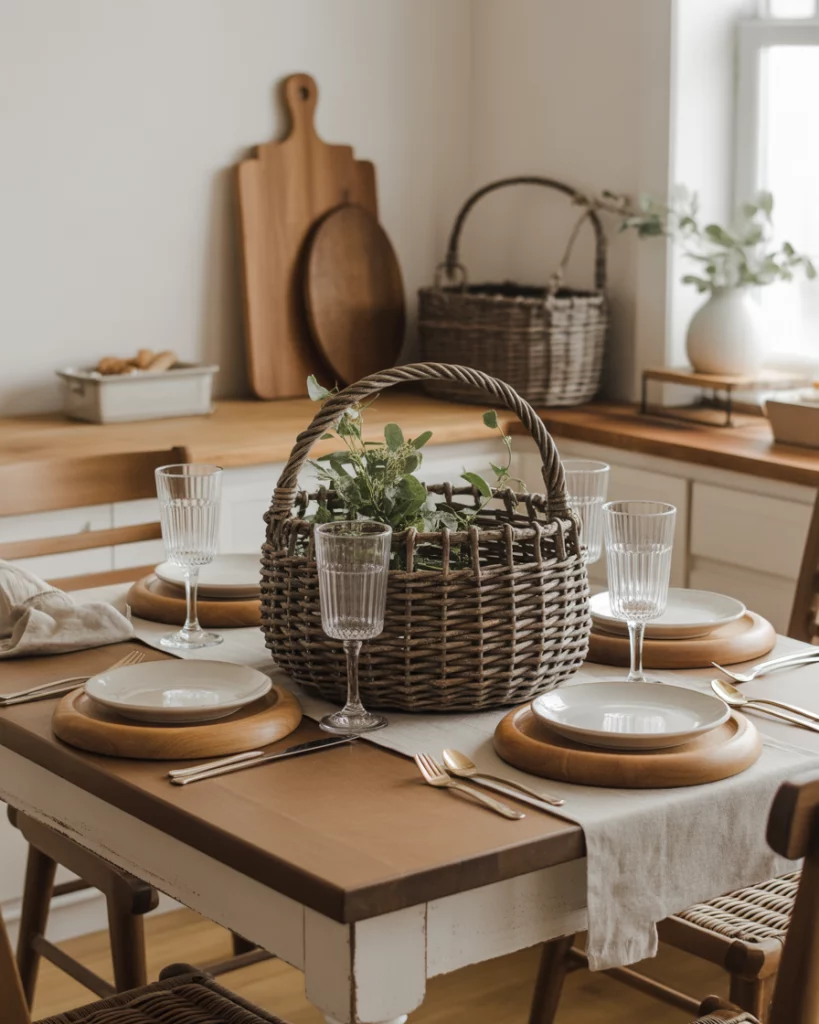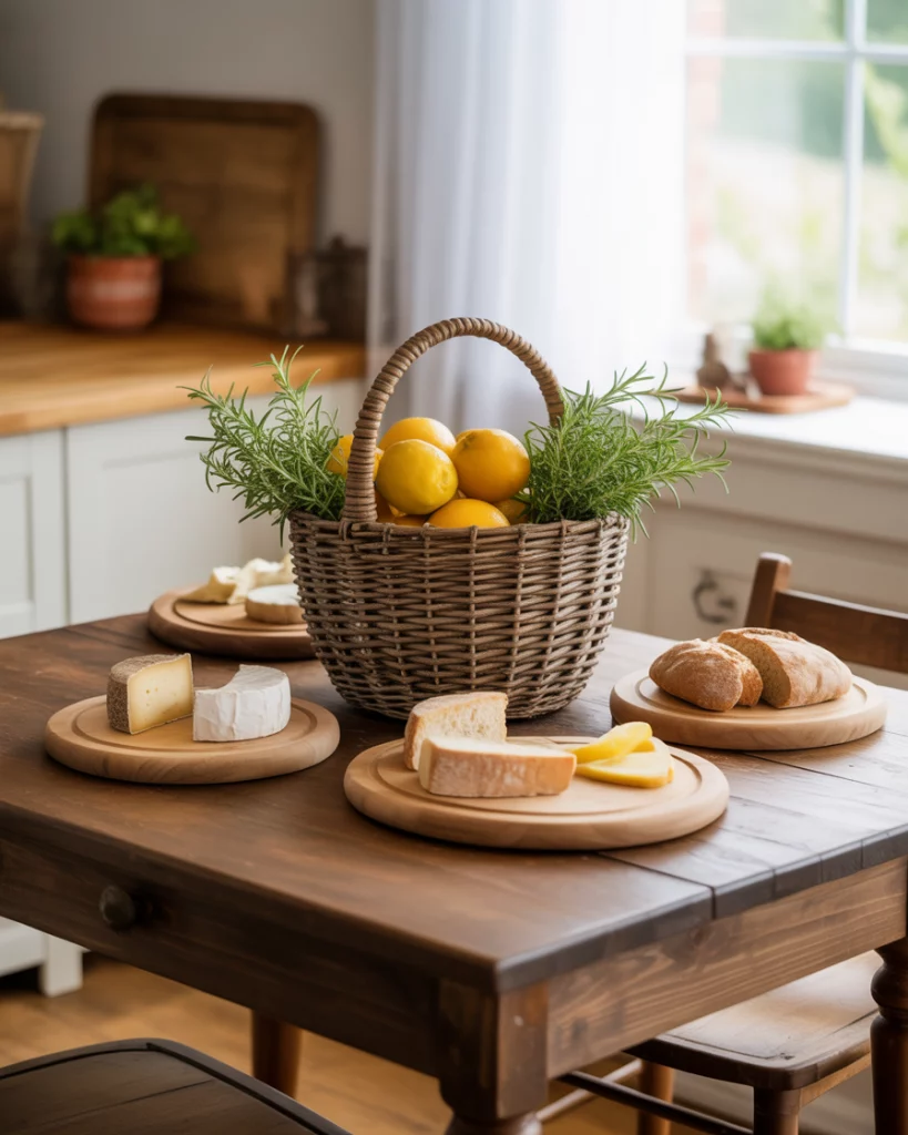 A brown-toned country style table sets a cozy scene for everyday life. A square table can hold a rustic basket filled with fruit or bread, paired with wooden serving boards. This approach is casual, practical, and deeply connected to the traditions of family kitchens.Southern Livingoften praises country decor for its lived-in beauty and everyday warmth.