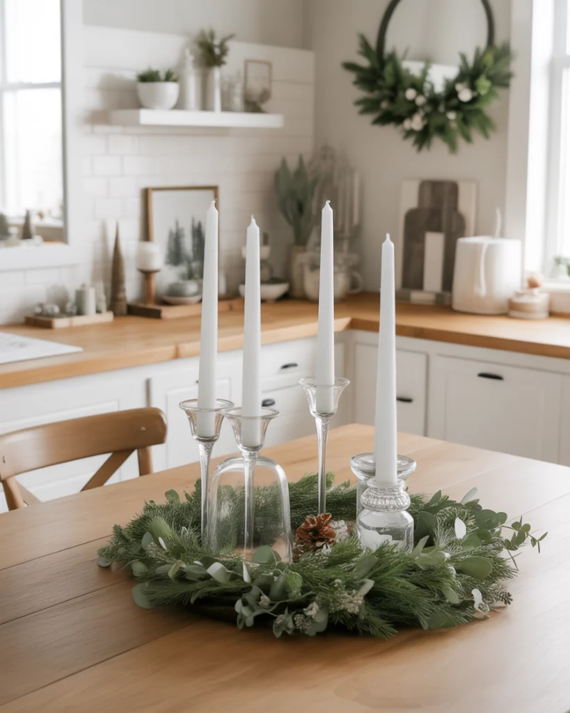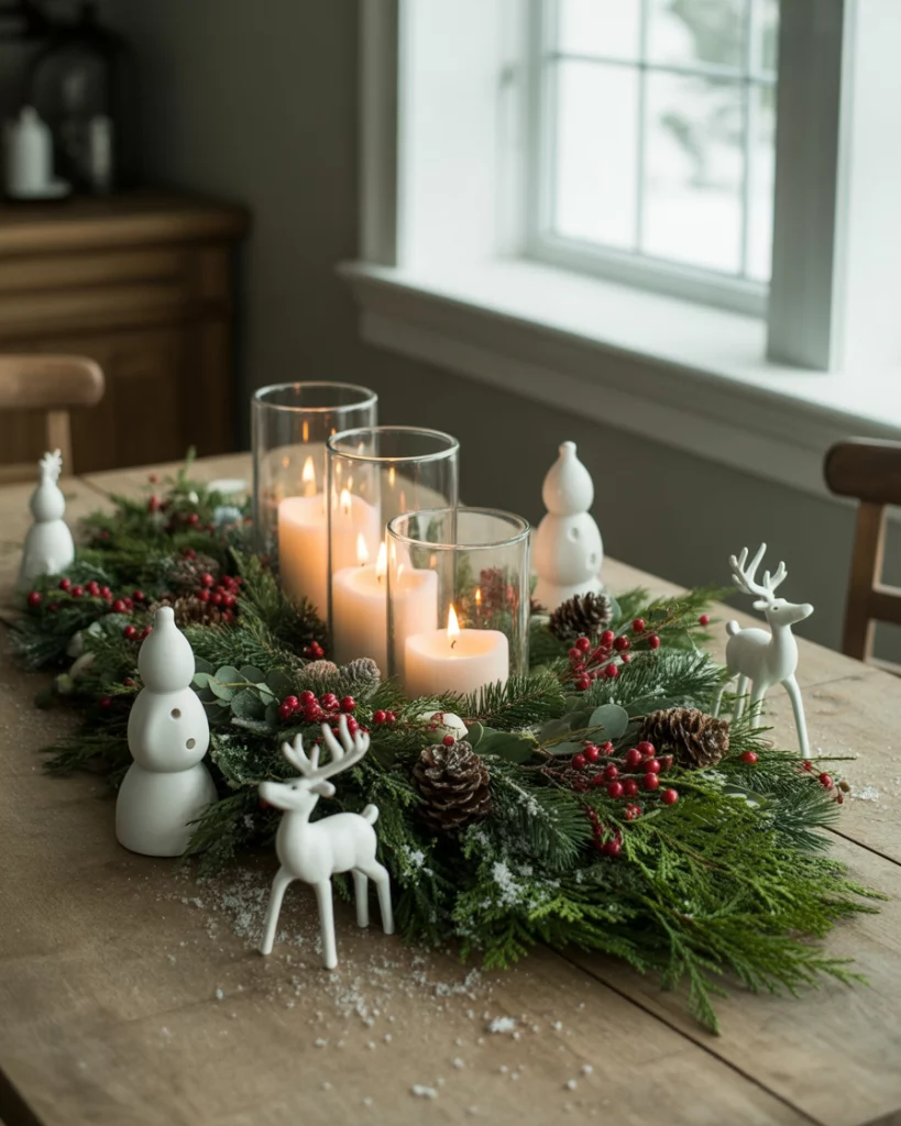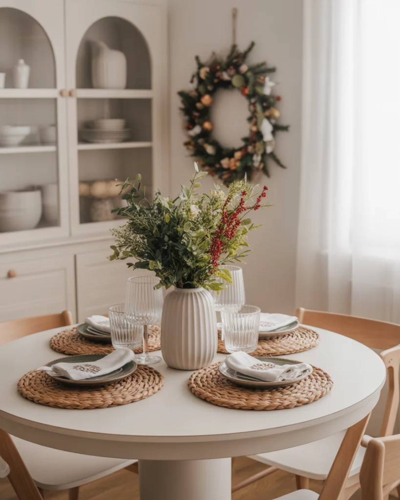 Christmas decor in 2026 blends modern farmhouse coziness with understated sparkle. A long rectangle table with a white runner, glass candle holders, and rustic greenery creates a look that feels both festive and timeless. On a small round table, a single Christmas wreath-style centerpiece adds instant charm. Many design influencers likeStudio McGeeemphasize keeping Christmas decor natural yet elegant.