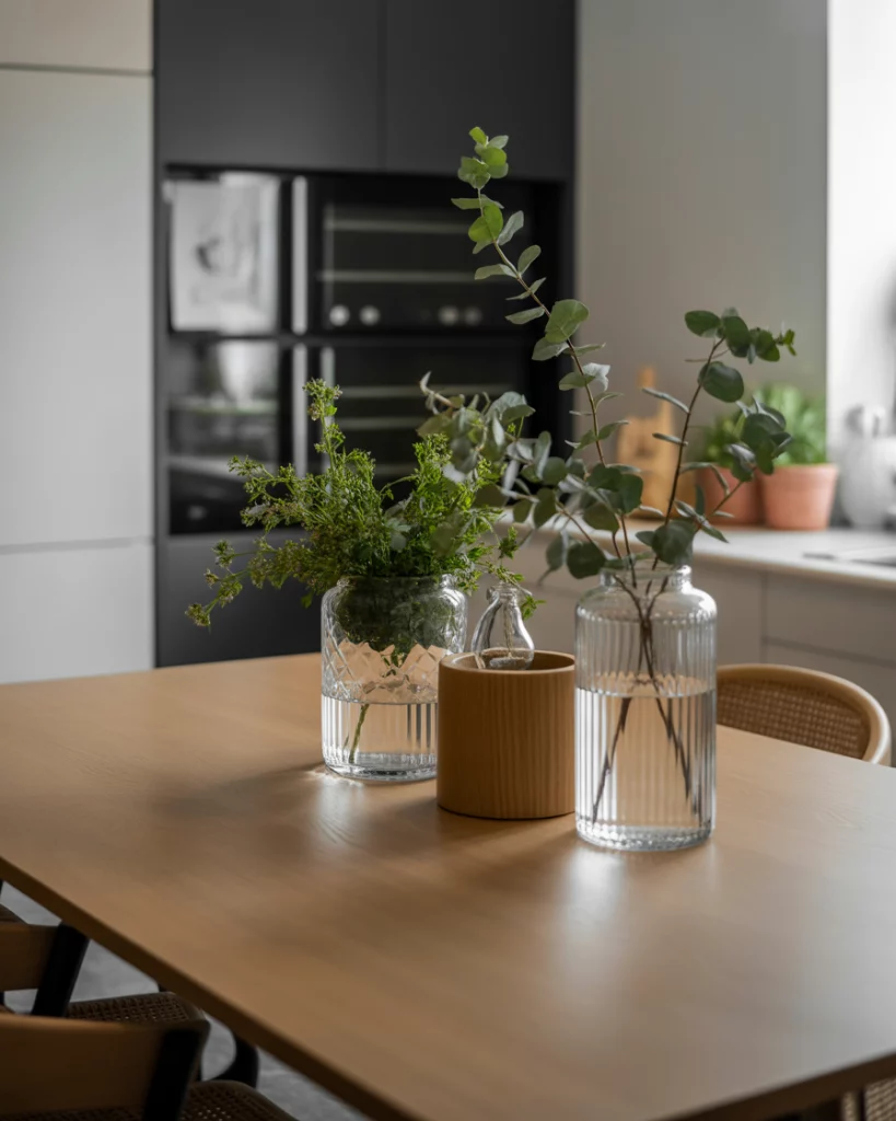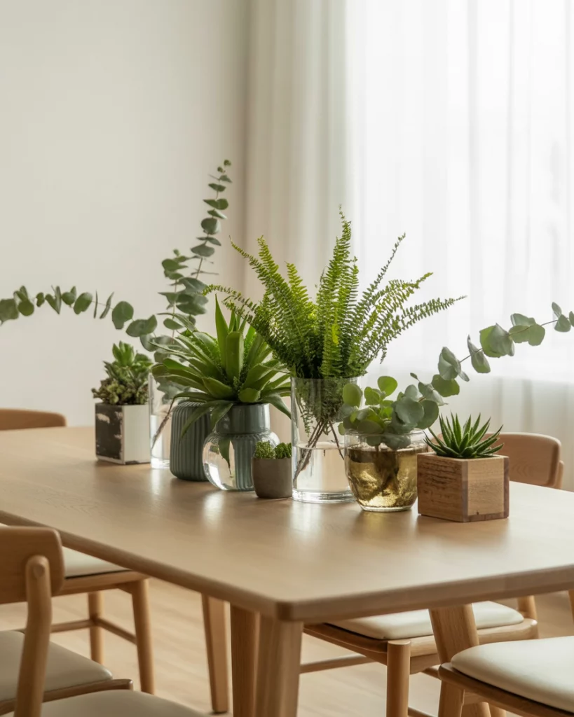 A rectangle table can feel fresh year-round with everyday centerpiece ideas featuring greenery. Simple eucalyptus branches in a glass vase or a long row of herbs in wooden planters bring life to the space. This style blends modern elegance with rustic charm, aligning with eco-friendly trends in 2026.Architectural Digesthighlights how greenery connects design with wellness.