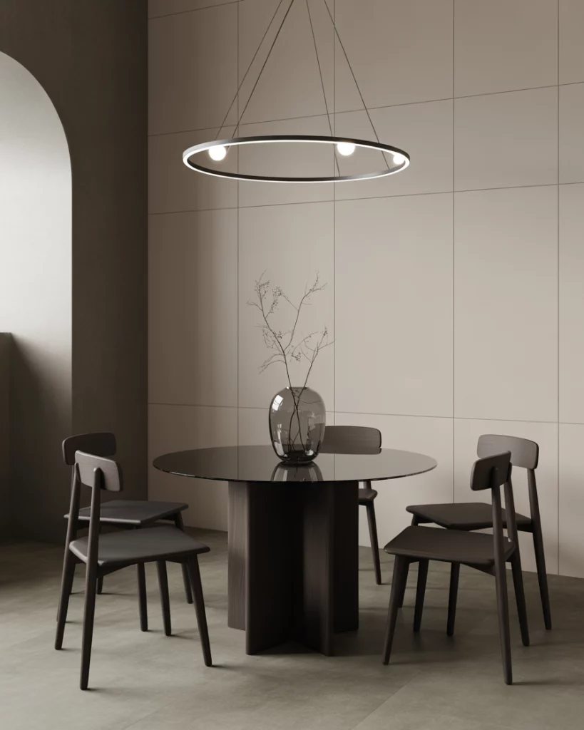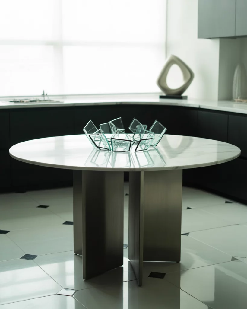 A circle or round table styled with glass accents creates a sleek yet approachable feel. A centerpiece everyday option might be a glass vase with seasonal flowers or layered bowls in white and black. This style is minimal but not cold, giving the table a modern edge while staying practical for everyday meals. Designers atApartment Therapynote that reflective surfaces like glass instantly brighten up a dining space, making small areas appear larger.