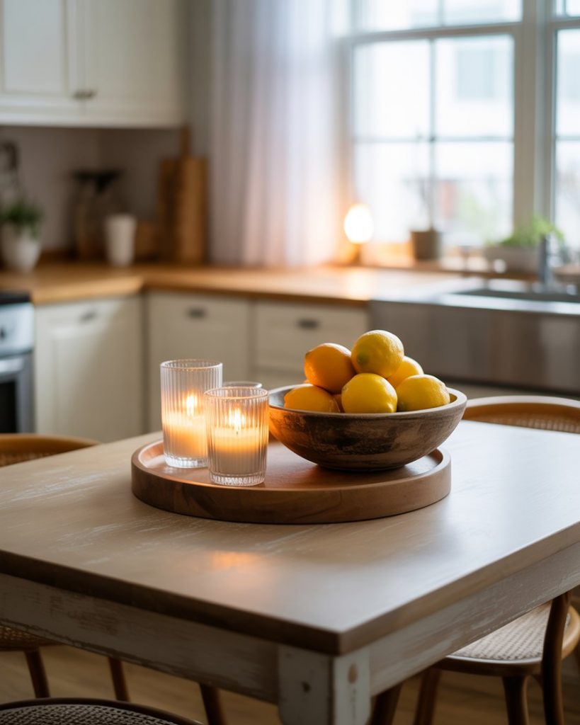 A square table can be tricky to style, but symmetry helps create a pleasing look. Using a circle tray with layered glass candle holders or a wooden bowl in the center provides balance. This arrangement works as a centerpiece everyday, keeping the table neat while still adding character. Decorators onHGTVsuggest that styling a square table is about embracing proportion, making sure each side feels equally anchored.