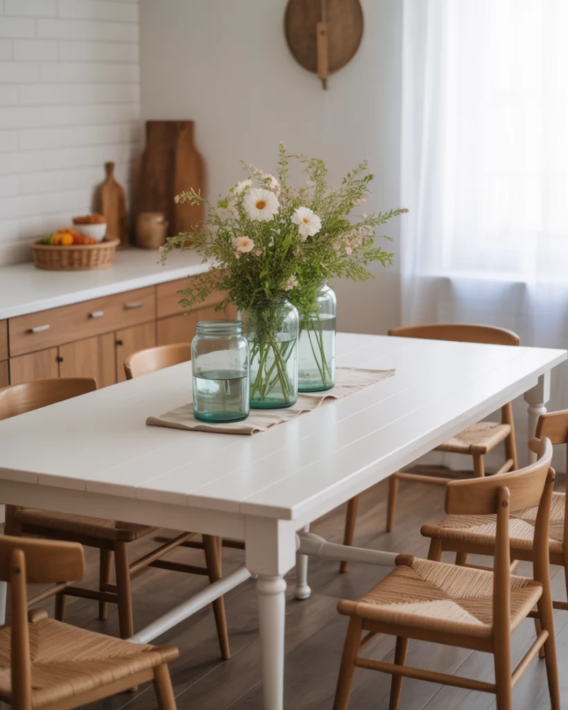 The modern farmhouse style thrives on light tones, and a white runner paired with wooden elements makes any rectangle or round table glow. A cute touch might be small milk jars filled with wildflowers, offering both rustic appeal and everyday centerpiece ideas.Magnolia Journalemphasizes that mixing white with wood embodies simplicity while still feeling warm.