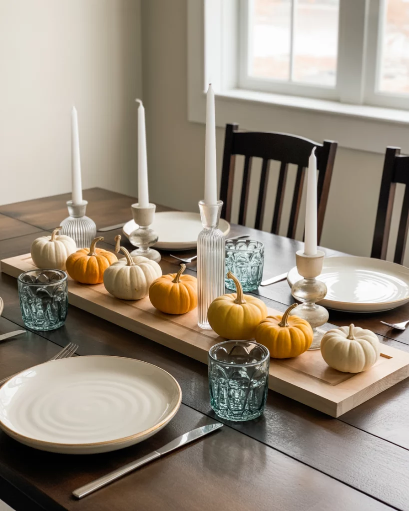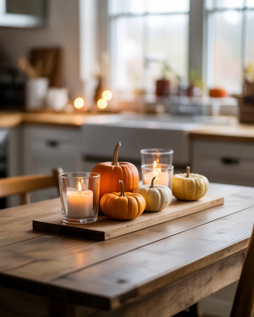 Autumn always brings cozy decorations for home, and fall 2026 emphasizes earthy textures with wood, brown, and rustic accents. A rectangle table looks striking with a wooden board topped with mini pumpkins, foliage, and glass candles. Even a round table can adopt the look by clustering seasonal items in a circle.Better Homes & Gardenssuggests layering in textiles like plaid runners for extra depth.