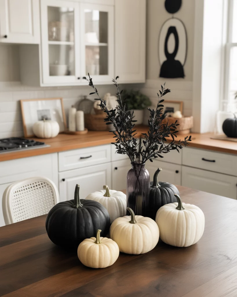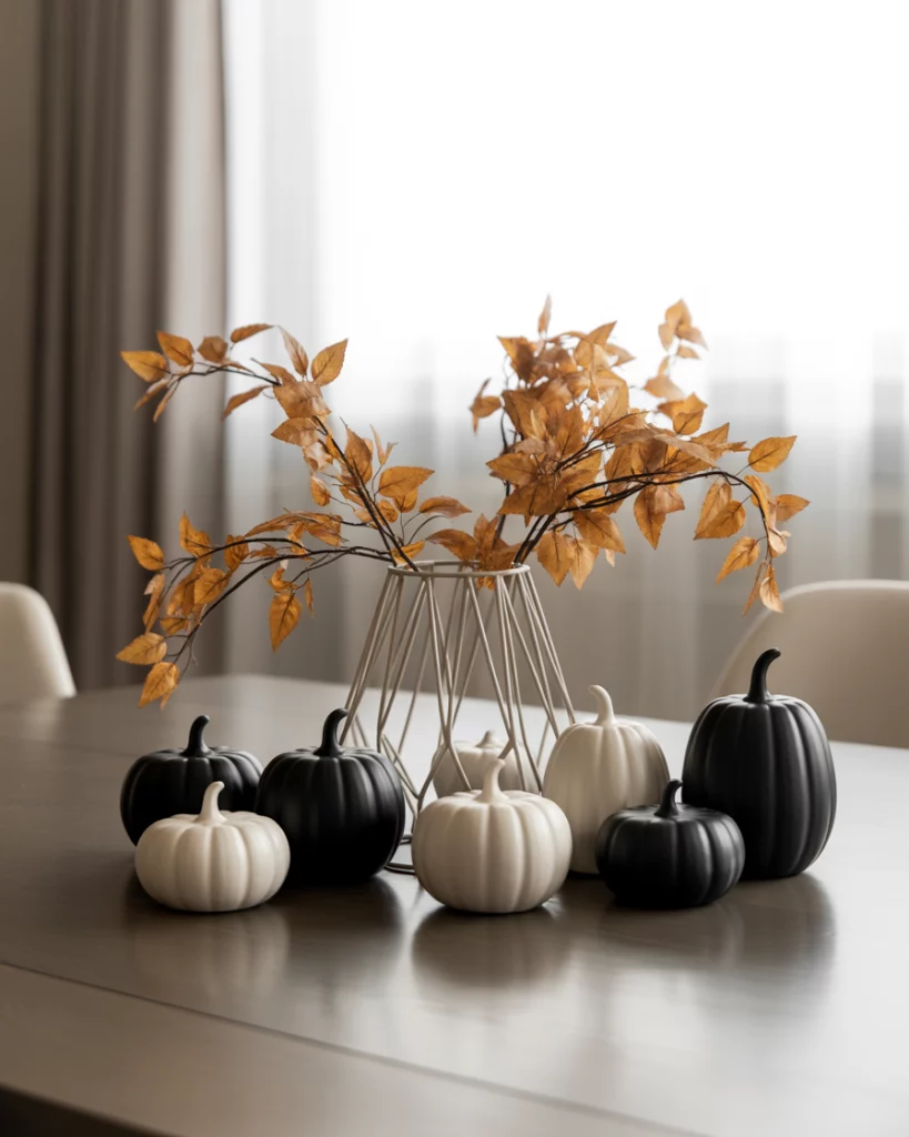 Halloween decor in 2026 favors chic centerpiece everyday options that don’t overwhelm. For a square or rectangle table, a black runner paired with white pumpkins and moody candles creates a stylish scene. On a round table, a circle of smaller items like skull figurines or glass jars with candy works beautifully. AsHGTVpoints out, the best Halloween decor strikes a playful yet sophisticated balance.