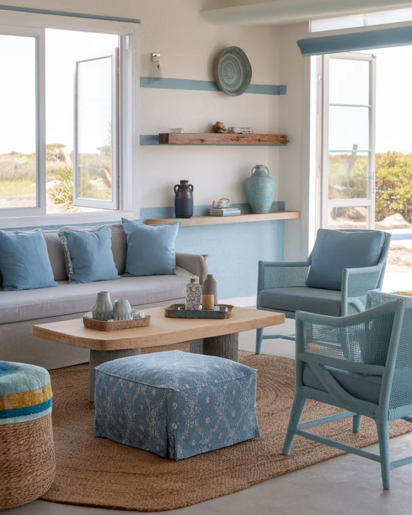 A coastal palette is all about breezy blue, sandy beige, and crisp white tones that bring the beach indoors. It’s ideal for anyone looking to create a light-filled, cozy environment—especially in small apartments or homes near water. Include jute rugs and whitewashed wood accompanied by a grey sofa and cushions sporting soft light blue and a grey colour. As highlighted by Coastal Living Magazine, this style keeps the space feeling open and calm.