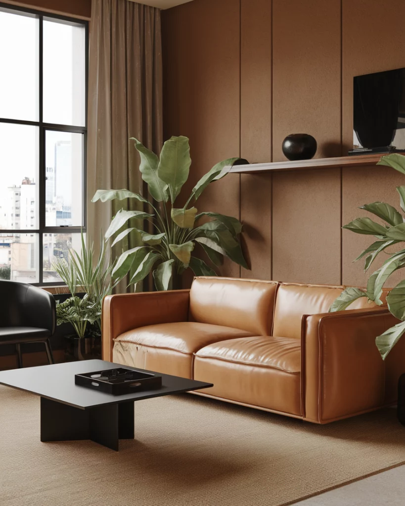 A tan leather sofa brings timeless warmth and works especially well in rooms with earthy walls like clay, taupe, or warm sand. This is an ideal mix and its ideally suited to the combinations of contemporary households. Dress in sage or black with contrasting accent, and add some greenery to give some texture. Designers at West Elm often recommend this pairing for versatile, grounded aesthetics.
