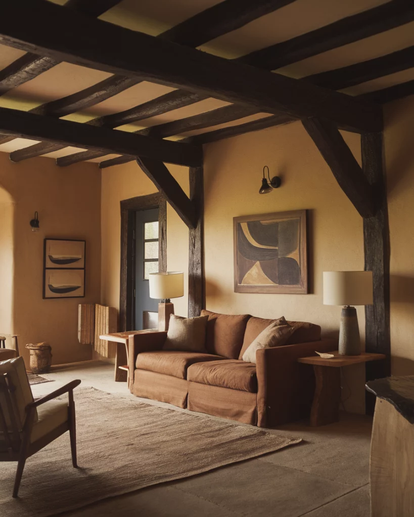 14. Rustic Retreat with Dark Beams and Warm Hues