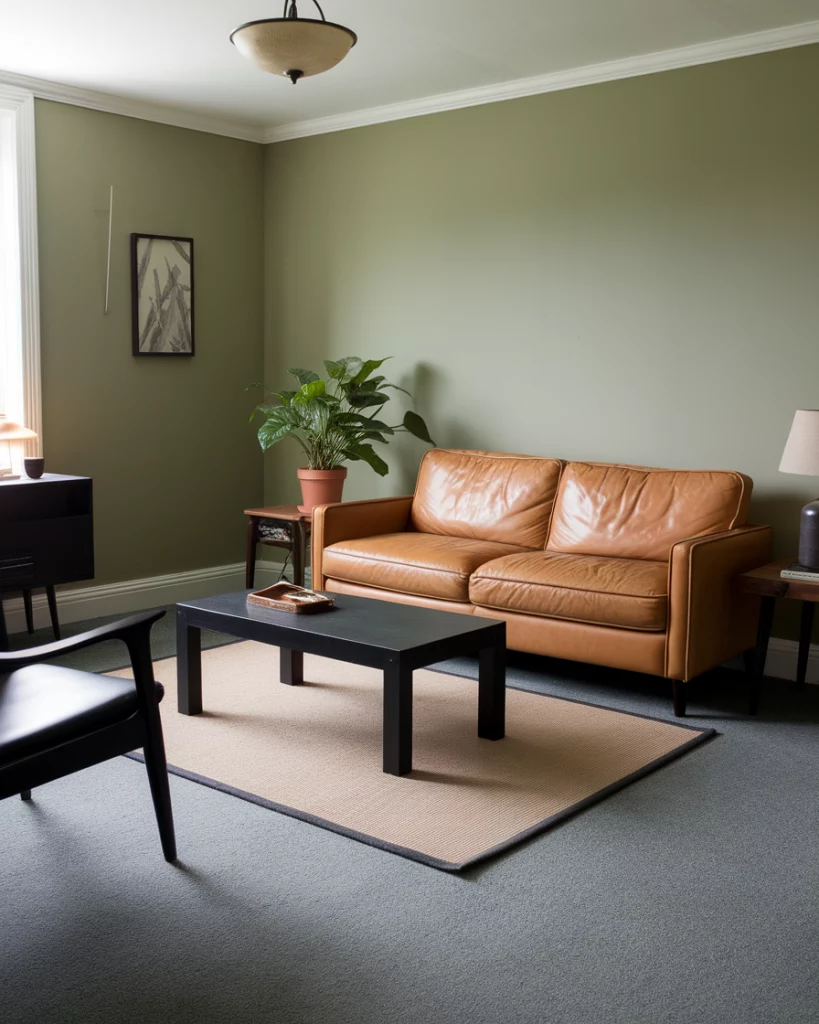 Sage green and black is a less expected combo but creates sleek, modern sophistication. Sage walls feel calming, while black accents (lamps, coffee tables, frames) add visual punch. This does well with a neutral furniture such as a grey carpet and a tan sofa. Referenced in Domino Magazine, this combo is great for those wanting subtle elegance with contrast.