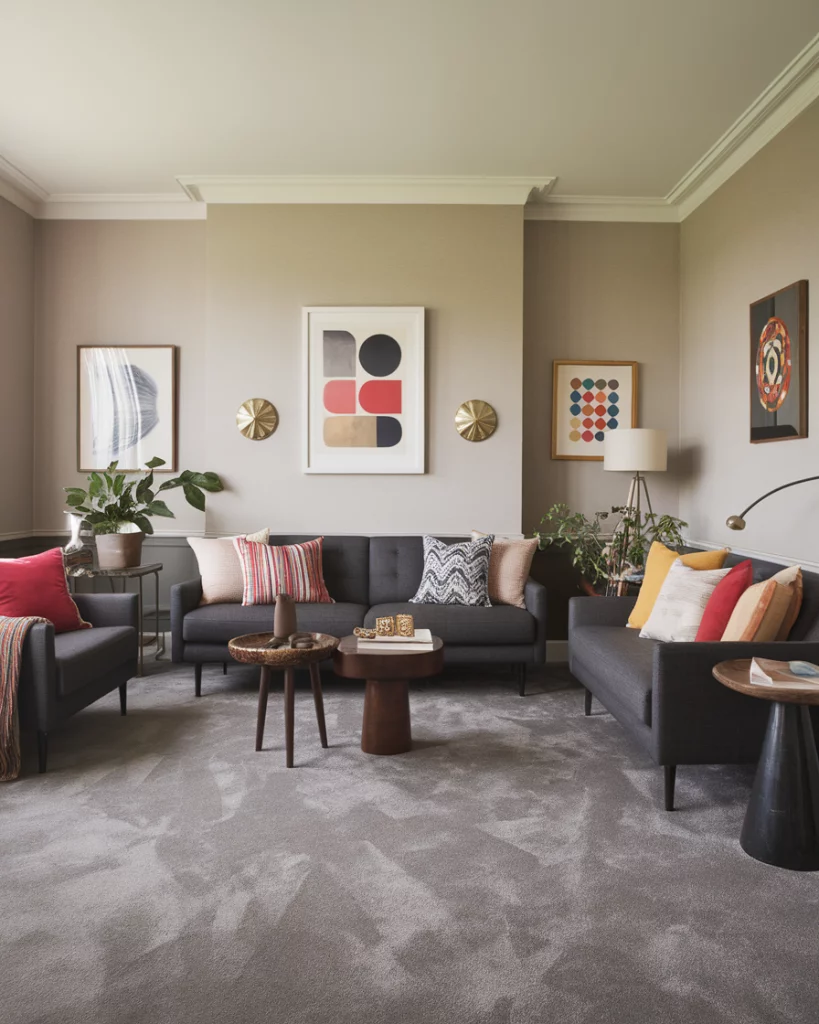 A charcoal couch anchors the room with depth, so offset its weight with neutral colors like warm whites, sandy beiges, or soft taupe walls. It provides a good space scheme in open concept areas or apartment living with little amount of natural light. Add layered textiles for softness. According to Houzz, this combo works especially well in modern urban interiors.