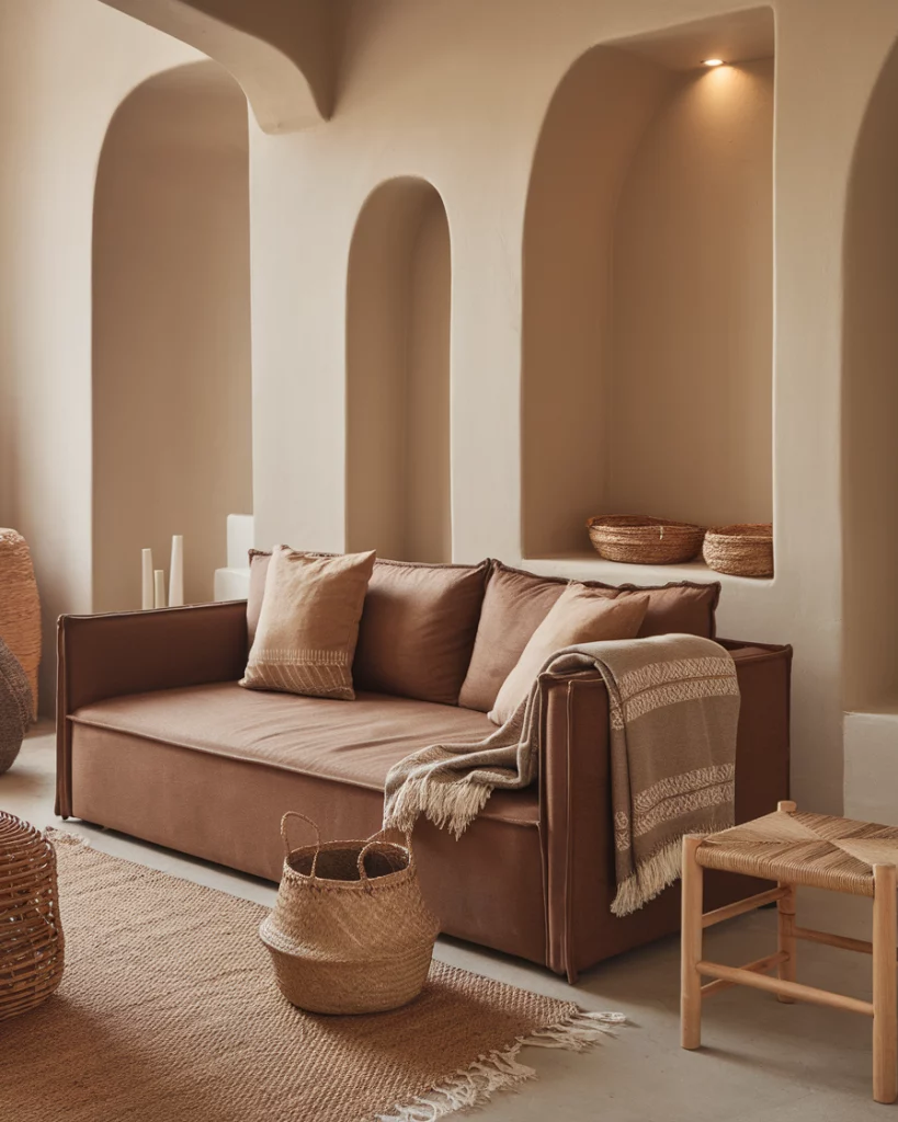 22. Warm Neutrals Around a Brown Couch