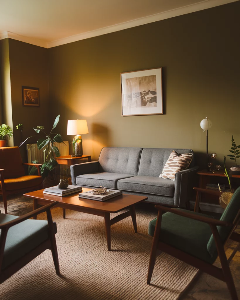 Olive green is the more understated cousin of emerald or sage, and it brings an organic, vintage vibe to any space. It coordinates well with the colour of grey especially when in combination with grey sofa or grey sofa styling. Use olive against stone-toned wall or through a large rug and adjust it with stone-coloured furnishings or linen. According to Domino Magazine, olive green suits both mid-century and traditional homes.