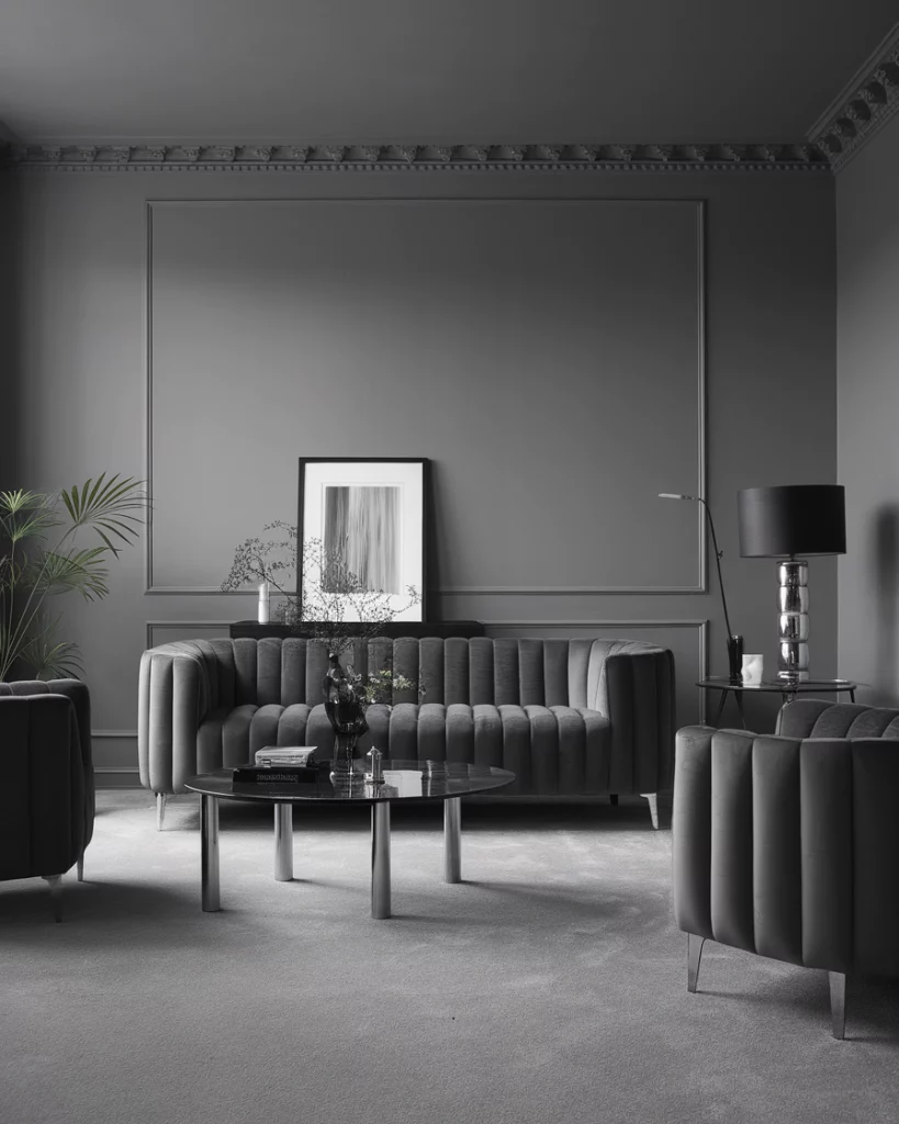 A monochromatic color scheme doesn’t mean boring—it means layering tones of the same color, like all-greys or all-tans, to create harmony. To take an example, the dark grey color sofa combined with grey carpet, pale grey wall color, and chrome fixtures will be sleek and minimalist in appearance. To not feel sterile, make use of plenty of texture–velvet, knits, glass, etc. This style is backed by Architectural Digest as a high-design approach.