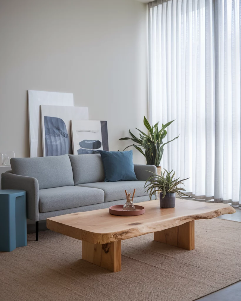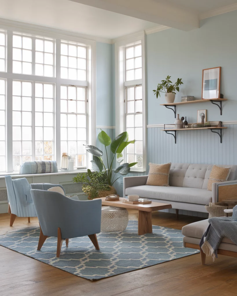 A coastal palette is all about breezy blue, sandy beige, and crisp white tones that bring the beach indoors. It’s ideal for anyone looking to create a light-filled, cozy environment—especially in small apartments or homes near water. Include jute rugs and whitewashed wood accompanied by a grey sofa and cushions sporting soft light blue and a grey colour. As highlighted by Coastal Living Magazine, this style keeps the space feeling open and calm.