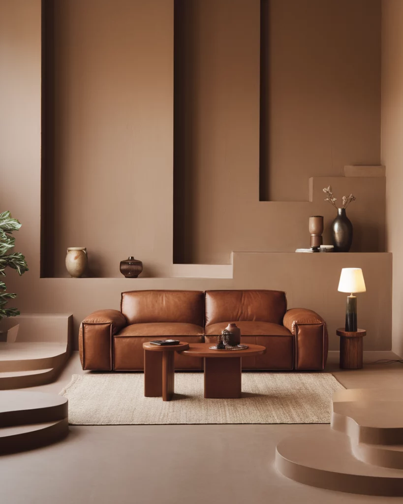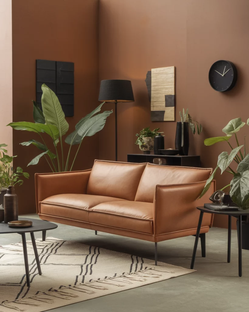 A tan leather sofa brings timeless warmth and works especially well in rooms with earthy walls like clay, taupe, or warm sand. This is an ideal mix and its ideally suited to the combinations of contemporary households. Dress in sage or black with contrasting accent, and add some greenery to give some texture. Designers at West Elm often recommend this pairing for versatile, grounded aesthetics.