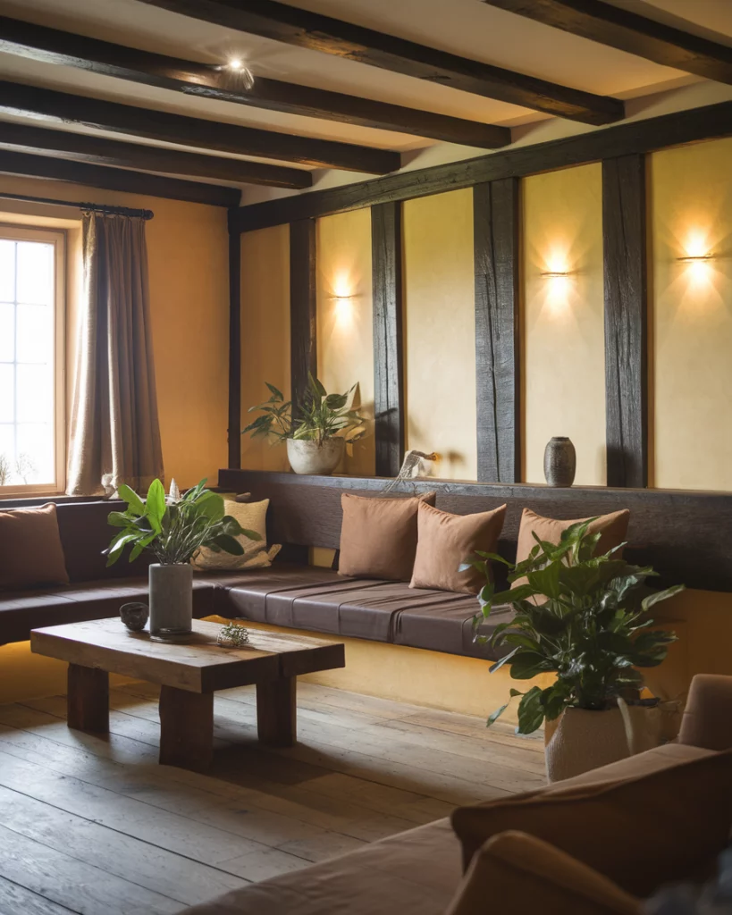 14. Rustic Retreat with Dark Beams and Warm Hues