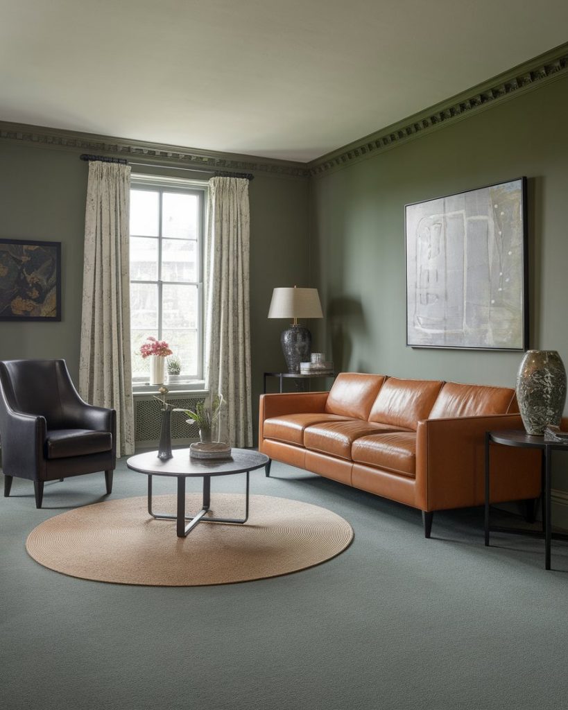 Sage green and black is a less expected combo but creates sleek, modern sophistication. Sage walls feel calming, while black accents (lamps, coffee tables, frames) add visual punch. This does well with a neutral furniture such as a grey carpet and a tan sofa. Referenced in Domino Magazine, this combo is great for those wanting subtle elegance with contrast.
