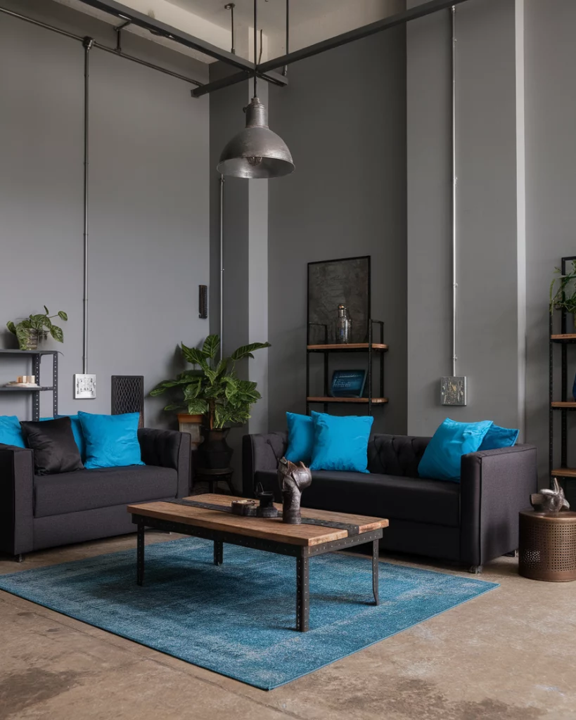 Grey tones dominate industrial interiors, especially with concrete textures, metal accents, and a dark grey sofa. Add some blue accessories such as artwork, vases, pillows to make the room not to feel too cold. This style, supported by designers at Dwell, suits urban lofts and industrial-style homes perfectly.