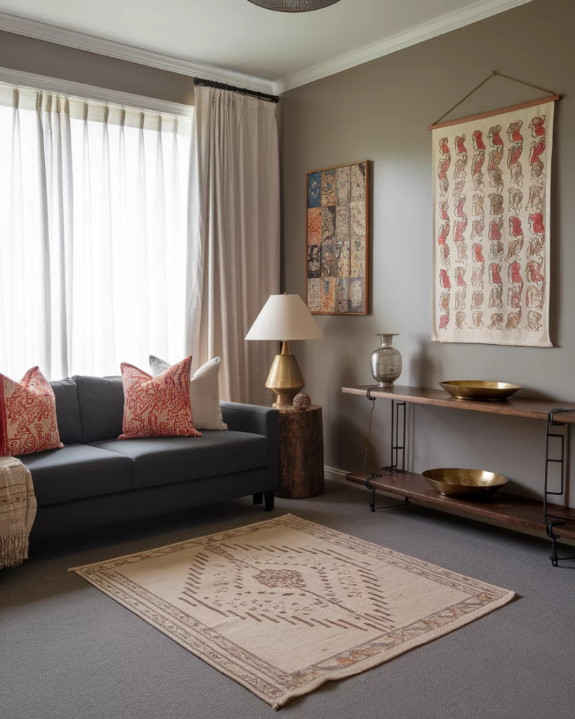 You can celebrate Indian design with a subtle twist by choosing neutral backdrops—ivory, sandstone, or pale taupe—and layering them with colorful accents like block-print pillows or brass decor. A grey carpet and a charcoal couch balance the look and help to avoid cluttering the overall look. As recommended by Saffron and Poe, this approach makes Indian décor accessible for minimalist homes.