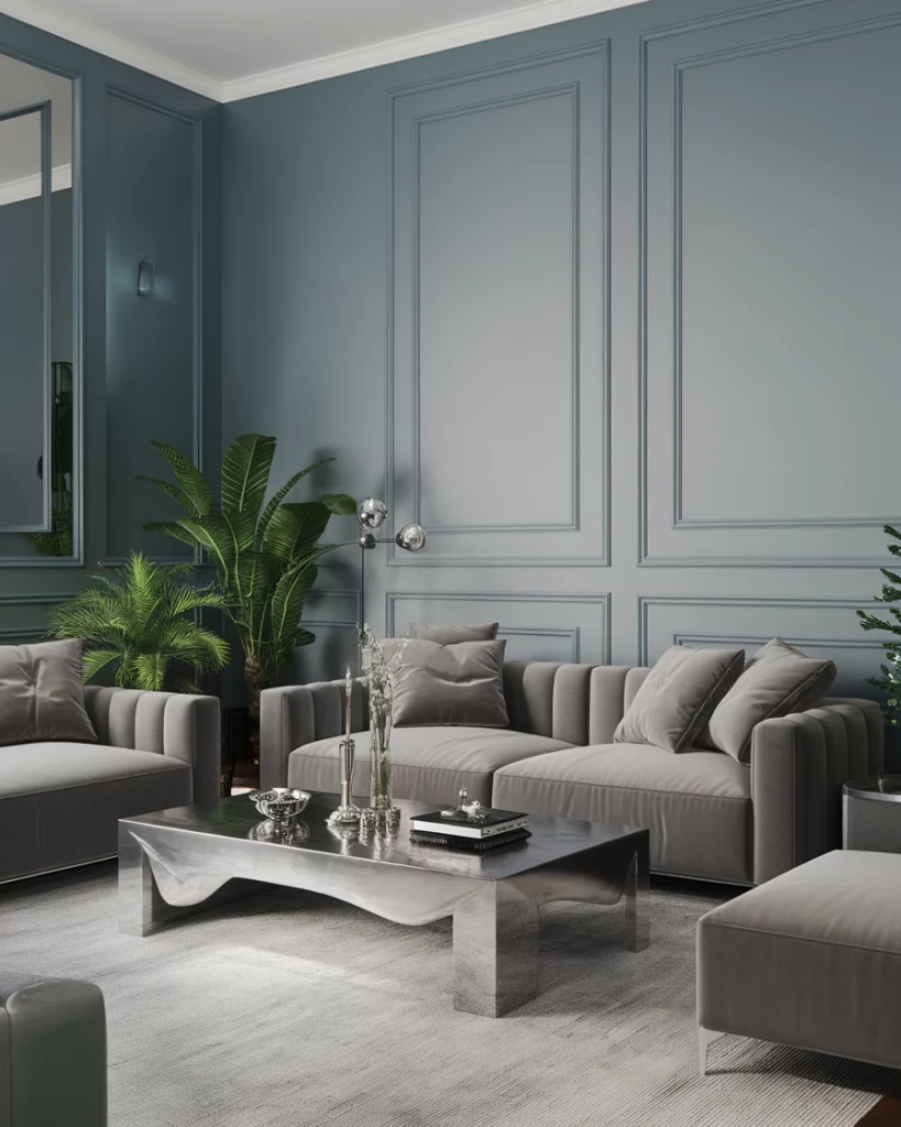 Combining blue tones with a grey sofa creates a soft, balanced atmosphere that feels both modern and timeless. The opposite color on the walls is a light shade of slate or denim blue, which creates some contrast, and silver or chrome variants of details help to style the room. The palette is very convenient in those apartments with little space but they should have style. Designers at The Spruce often suggest it for a calm, uncluttered aesthetic.