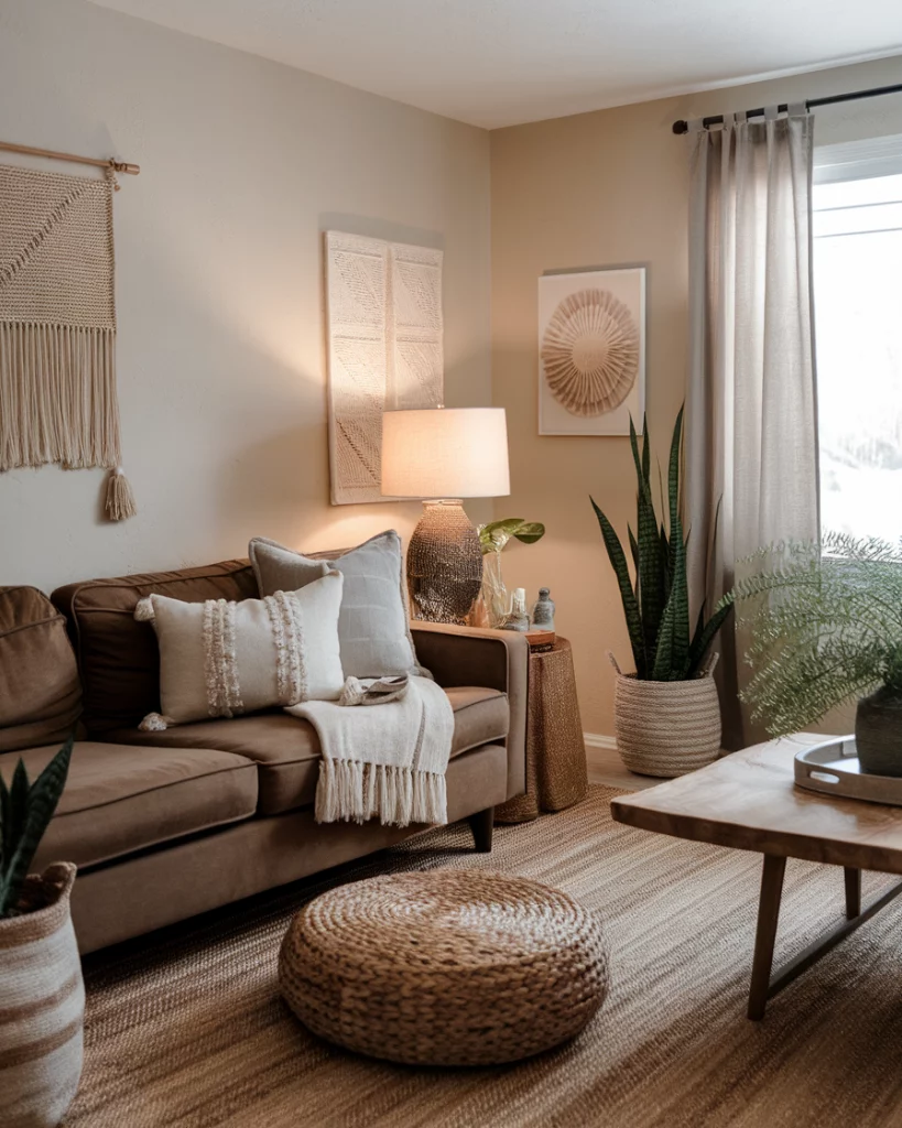 22. Warm Neutrals Around a Brown Couch