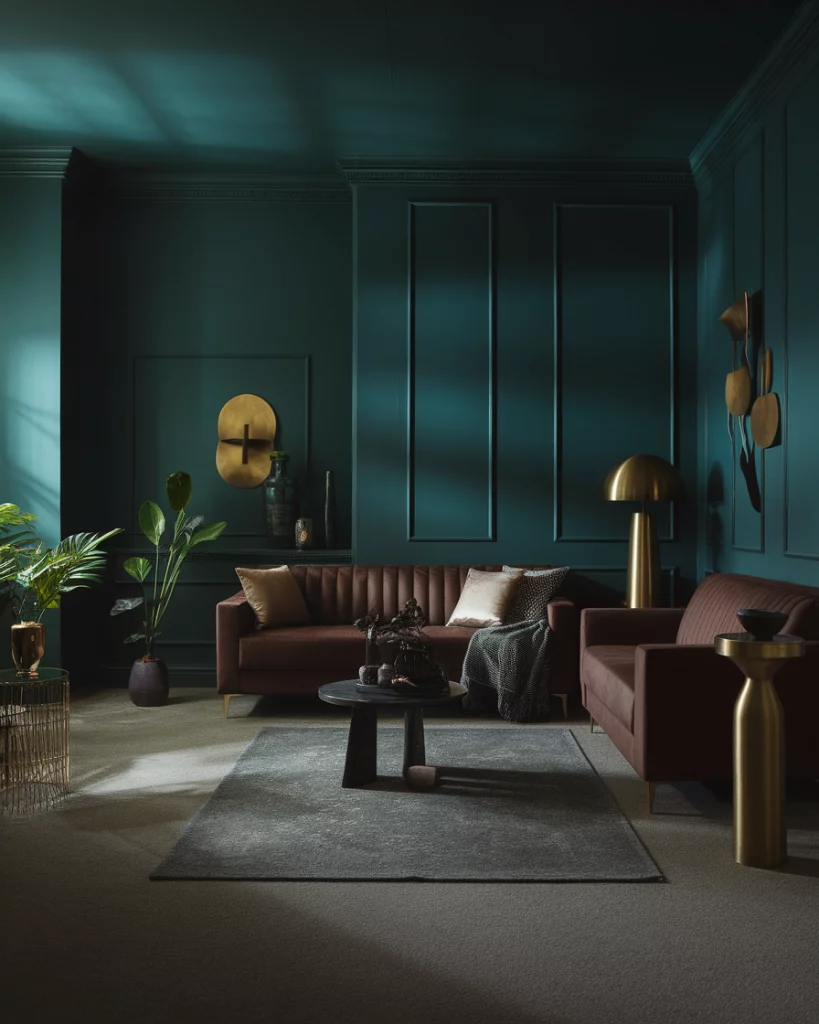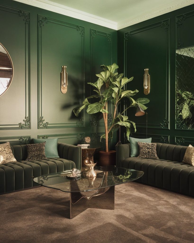 Dark green creates a rich, enveloping feel that’s dramatic yet grounding. Put it on any kind of walls, which have the influence of gold or brass, and combine it with a grey carpet and a brown couch to give a neutral, layered look. This palette can fit with **historic homes** or homes with dark beams and crown molding the best. As designer Leanne Ford puts it, dark green “makes your living room feel like a hug.”