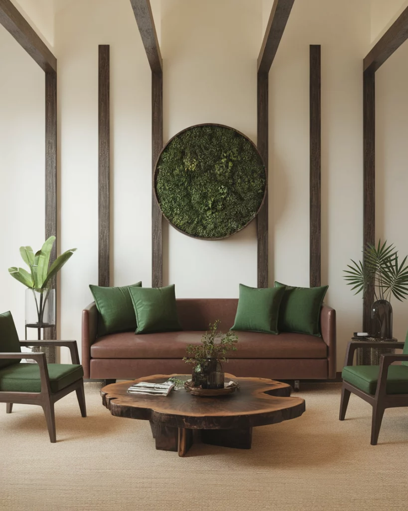 Indian interiors often celebrate rich jewel tones like emerald green, mustard yellow, and deep maroon, balanced with intricate patterns and wood textures. Introducing Indian style into a contemporary living room does not have to be complicated, to do so, one can hang patterned wallpaper or use hand-woven rugs. This scheme especially works with a brown couch or dark beams, creating a cozy yet cultural retreat.