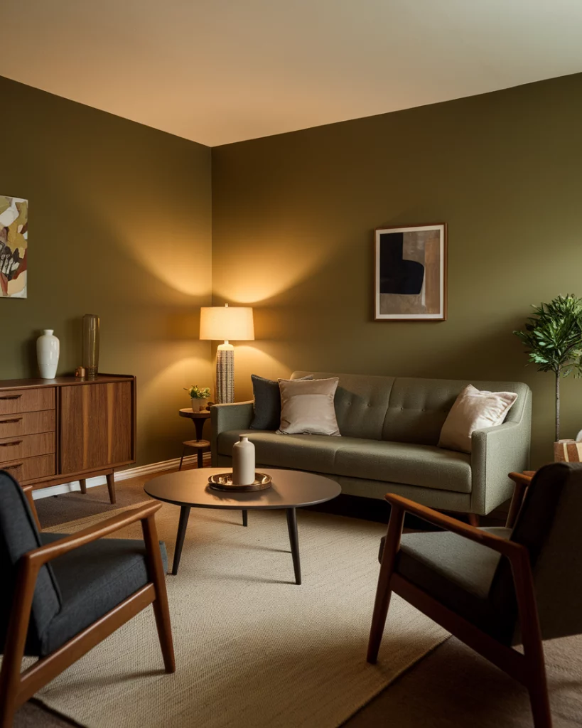 Olive green is the more understated cousin of emerald or sage, and it brings an organic, vintage vibe to any space. It coordinates well with the colour of grey especially when in combination with grey sofa or grey sofa styling. Use olive against stone-toned wall or through a large rug and adjust it with stone-coloured furnishings or linen. According to Domino Magazine, olive green suits both mid-century and traditional homes.