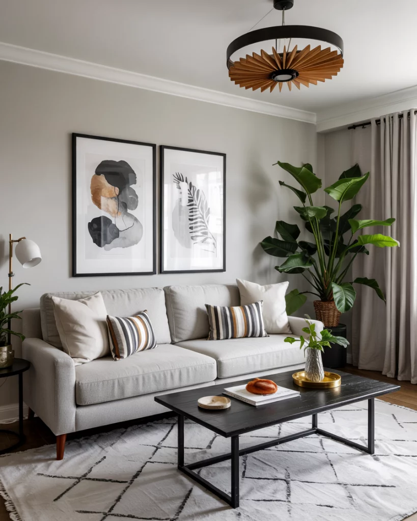 Designing for small spaces demands thoughtful scale and purposeful selection. A corner grey couch, a compact tv wall, and a multifunctional console can create a cozy lounge within a studio or one-bedroom apartment. Use warm lighting, soft throws, and tactile rugs to add the feeling of warm and cozy living. This is one of the most practical yet stylish of the small spaces apartment decorating ideas.