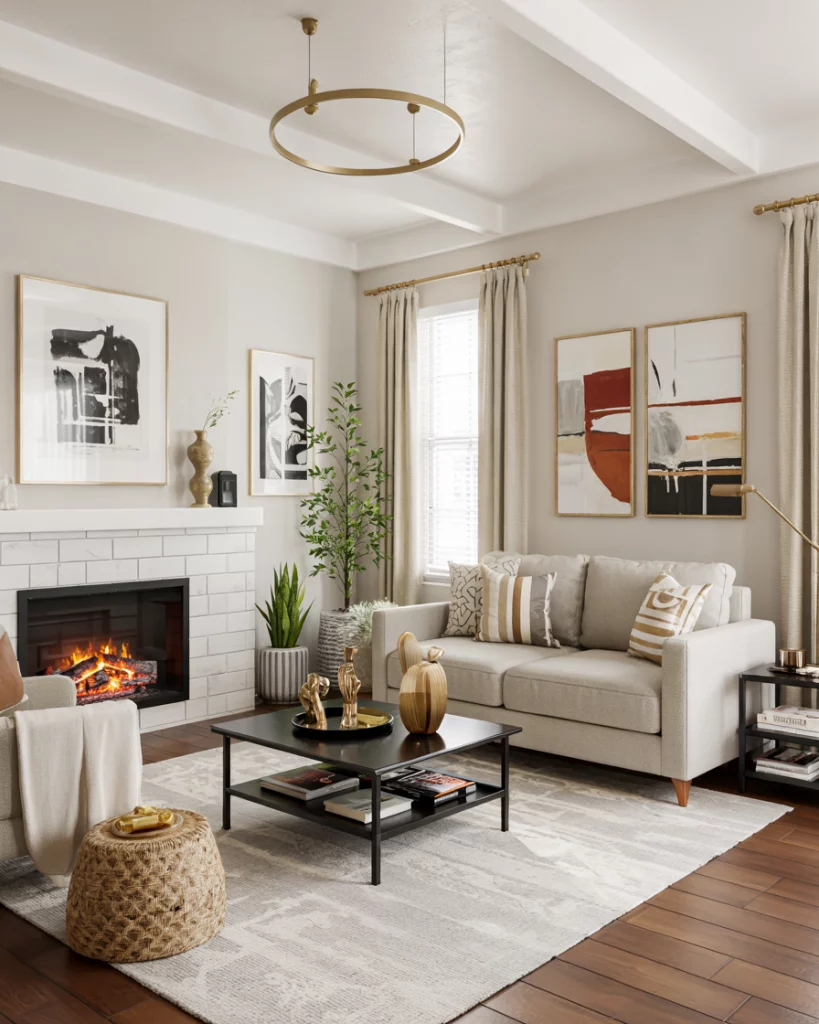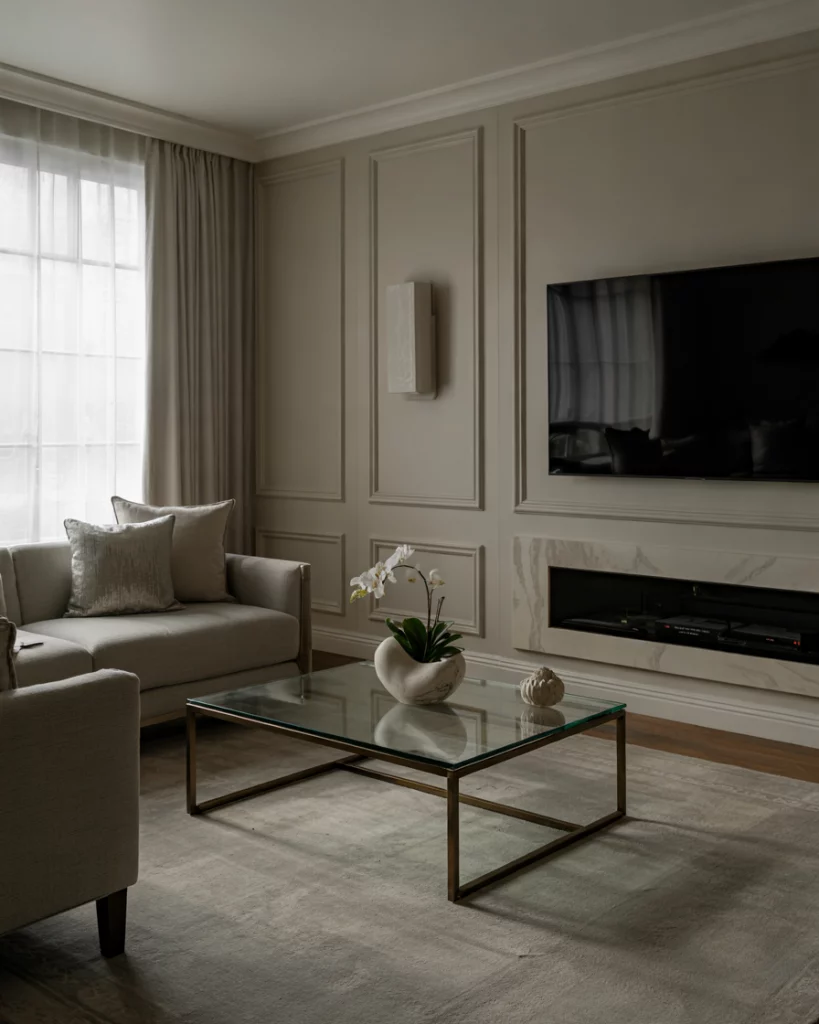 The term neoclassic often conjures grand columns and formless excess—but the 2026 take is different. This style marries architectural details (wainscoting, elegant mouldings) with modern furnishings and minimalist accessories. A grey couch, rich drapes, and a subtle tv wall blend seamlessly, producing a look that’s stately yet livable. The result: a room that feels elevated yet grounded—luxury without pretension.