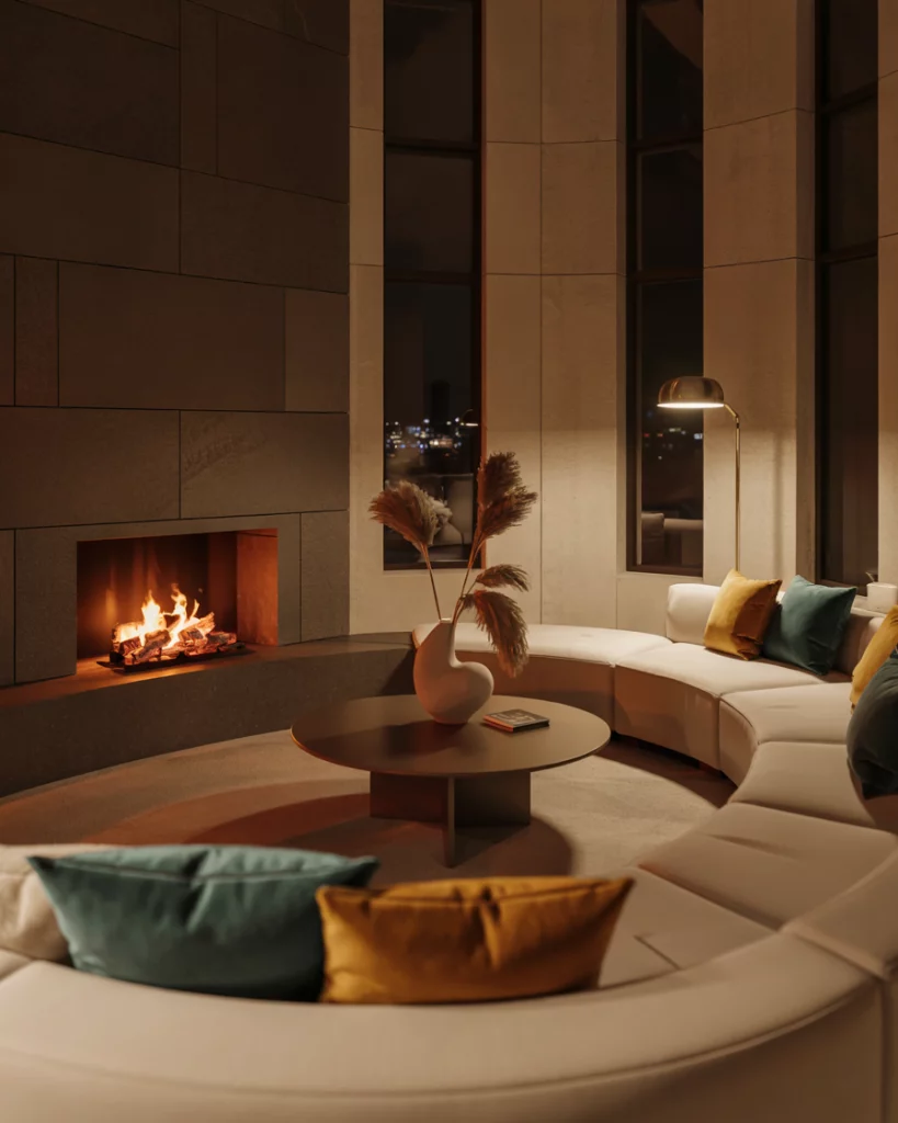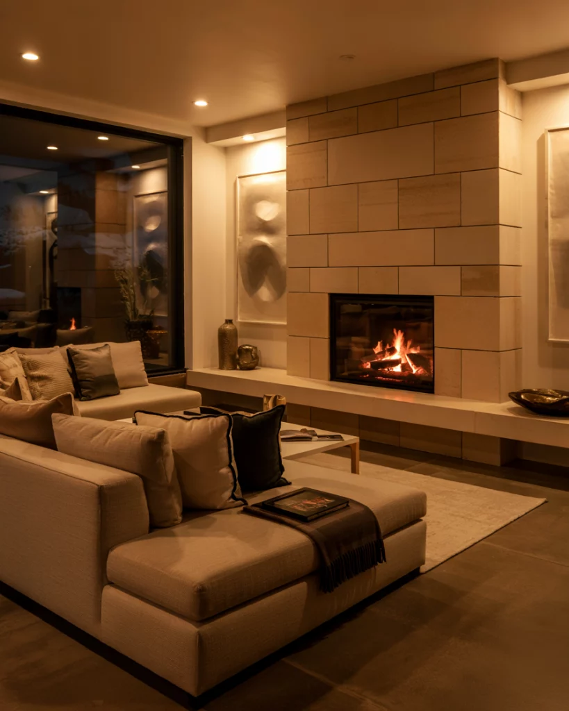For those craving modern luxury in a lounge space, consider making the fireplace the star of the room. A sleek built-in hearth with stone or metallic cladding, paired with a plush grey couch, layered rugs, and ambient lighting creates a sophisticated yet comfortable space. The juxtaposition of lavish textures and restrained colour (such as deep charcoal or warm beige) ensures an elegant feel while letting the room remain accessible.