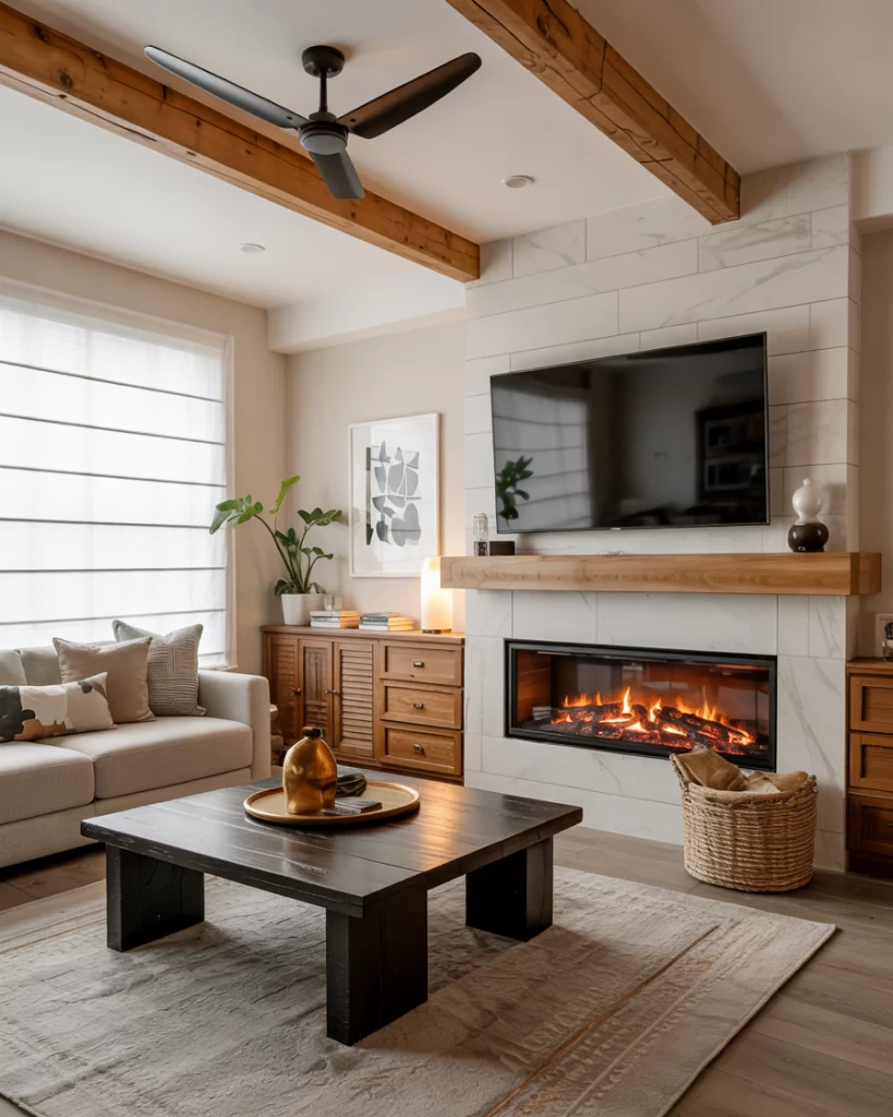 What if you blend the sleek minimalism of Japandi with the warmth and richness of Indian traditions? Here you get a refined mix: muted wood tones, textured rugs, low seating inspired by Japanese design, and colourful Indian textile accents. The combination speaks to both luxury and cultural depth. Incorporating a fireplace, layered lighting and a tv wall that recedes visually helps maintain balance and focus.