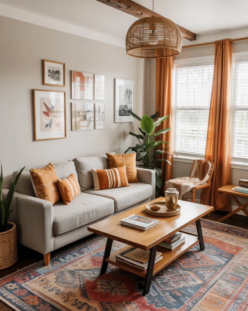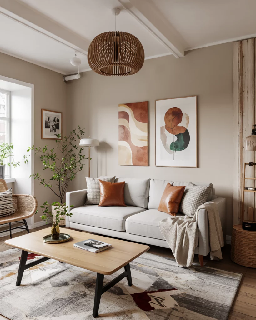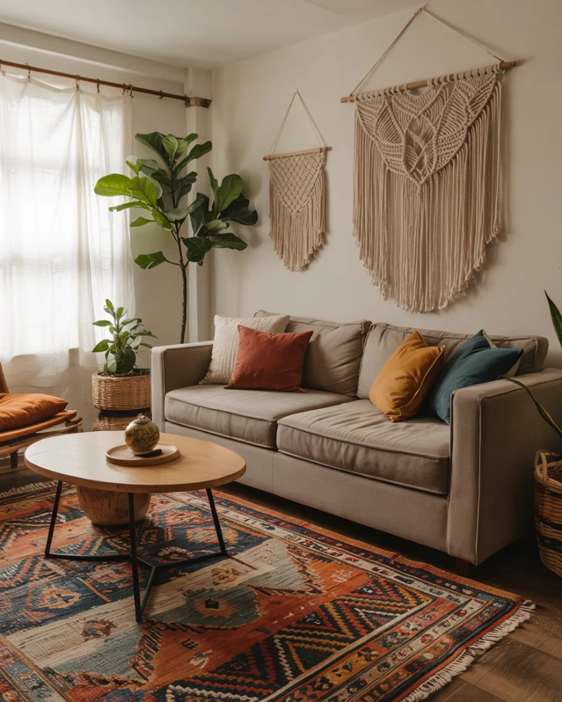 Boho style returns in 2026 but with more elegant structure. Think muted jewel tones, textured cushions, woven lighting, and an edited mix of patterns. The aim is balance: artistic freedom with luxury sensibility. A grey couch grounds the space, while colorful decor—macramé, ceramics, or vintage rugs—adds life and personality to small spaces.