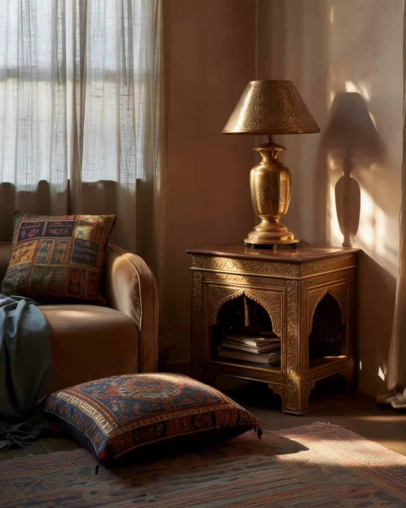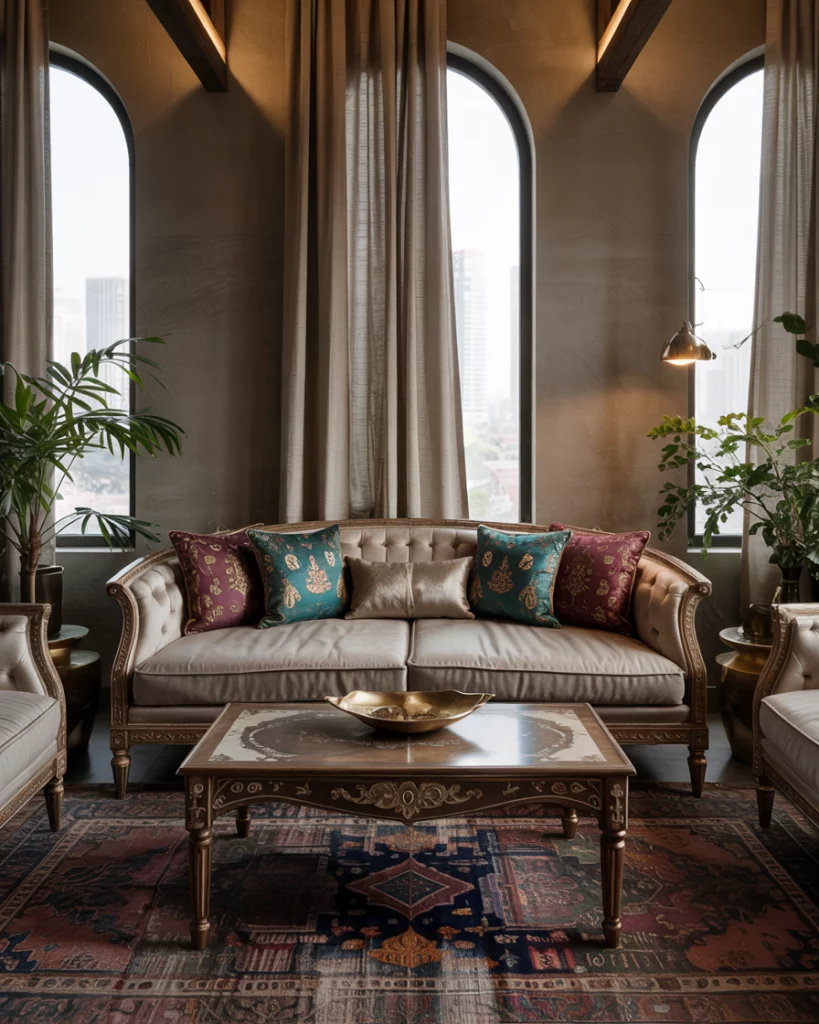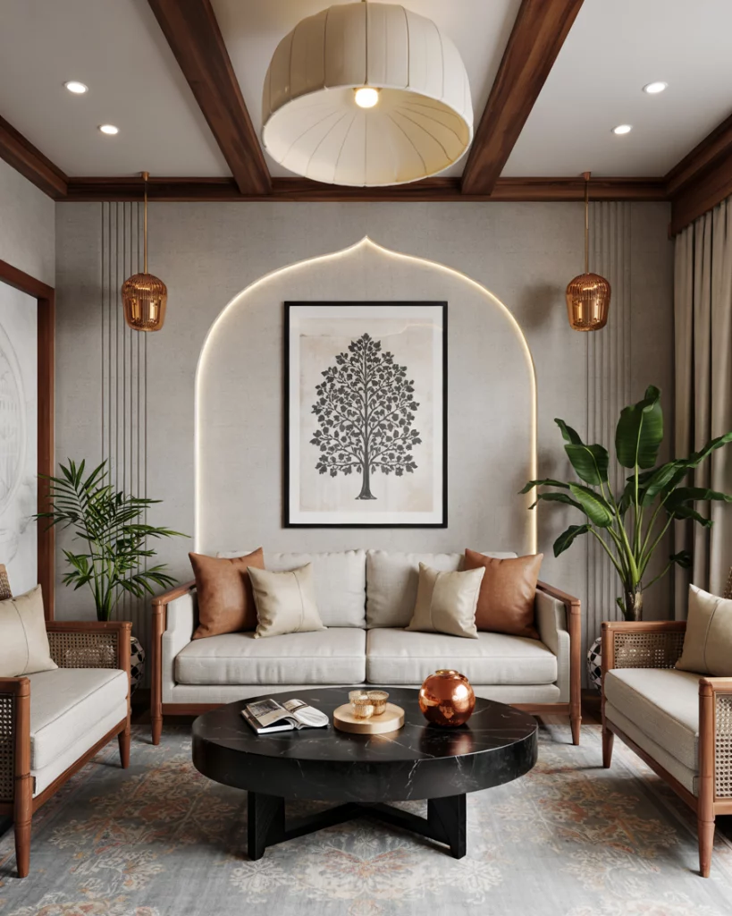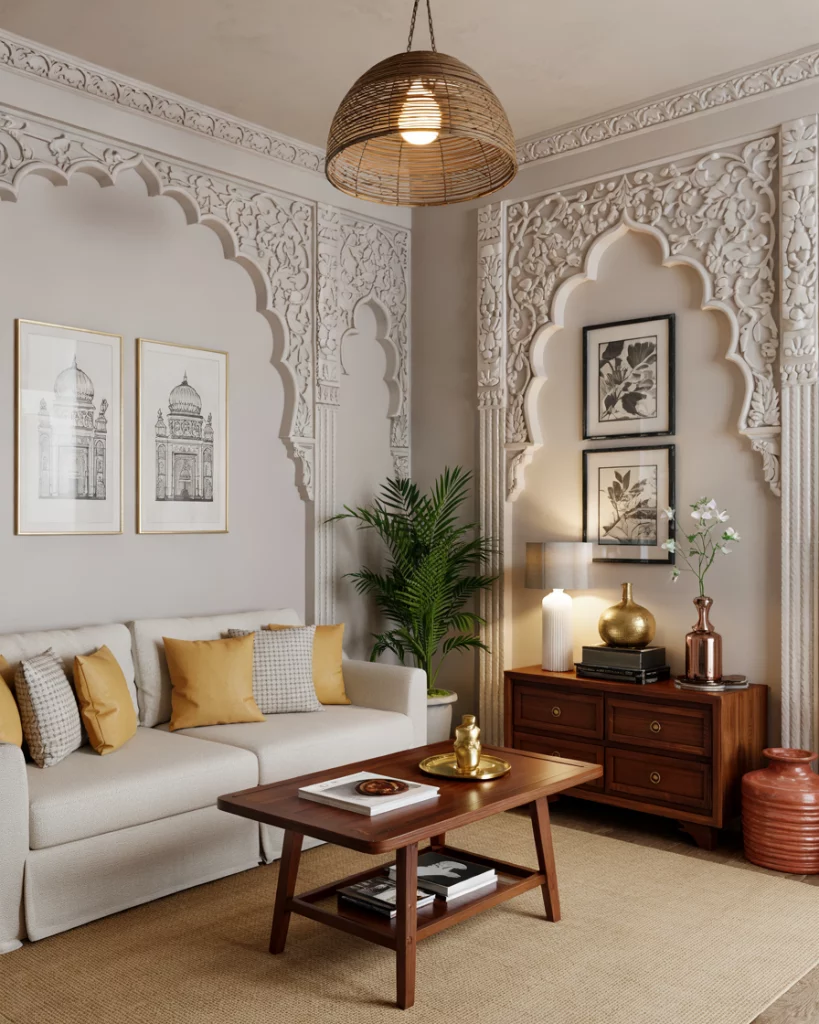 Incorporating Indian-inspired accents into a living room doesn’t mean heavy or ornate—it can funnel into a refined style of traditional Indian craft meets contemporary luxury. Think carved wooden screens or columns, rich textiles in warm colours, elegant brass elements, paired with modern seating and minimalistic walls. The effect: rooted in heritage yet clearly of the moment, satisfying both the desire for comfort and high design.