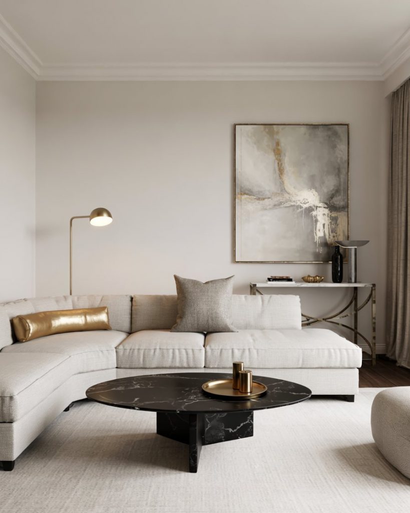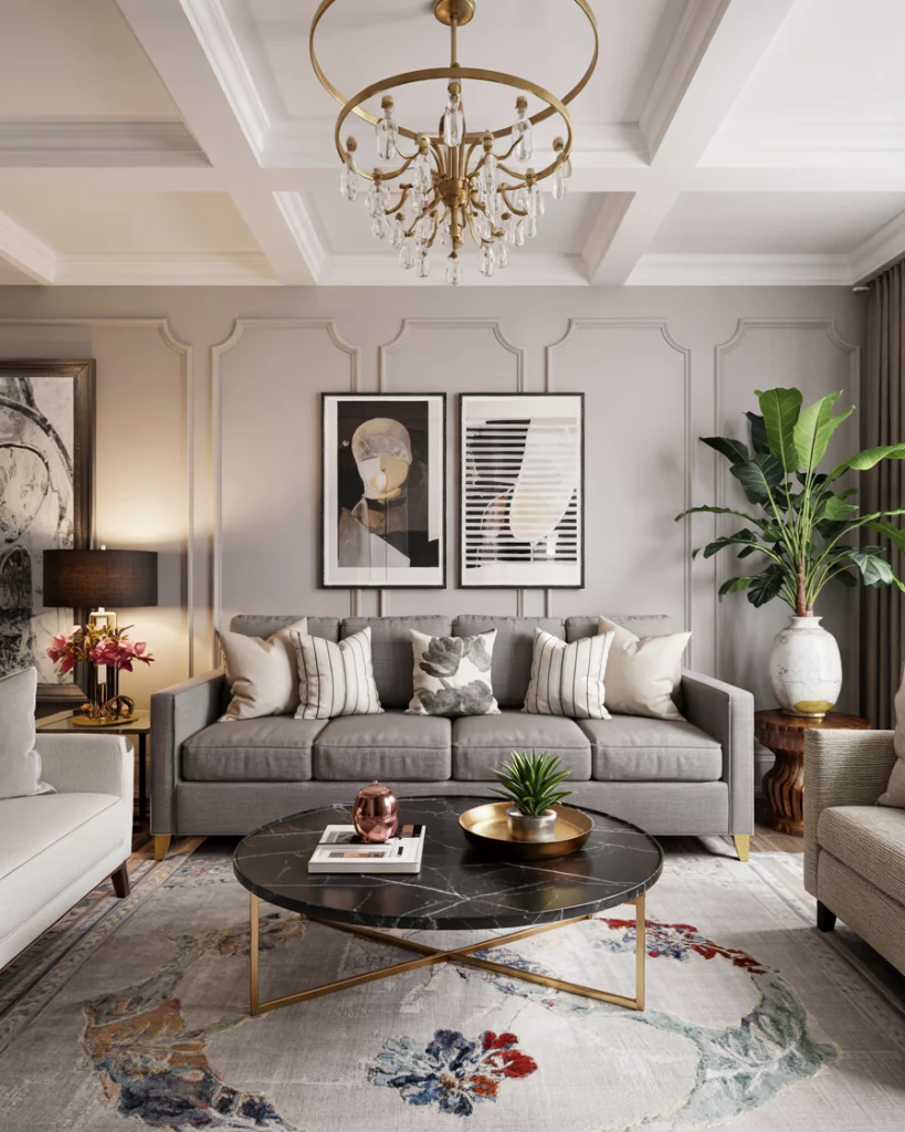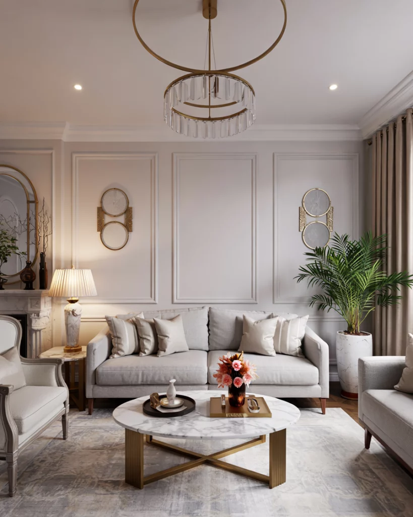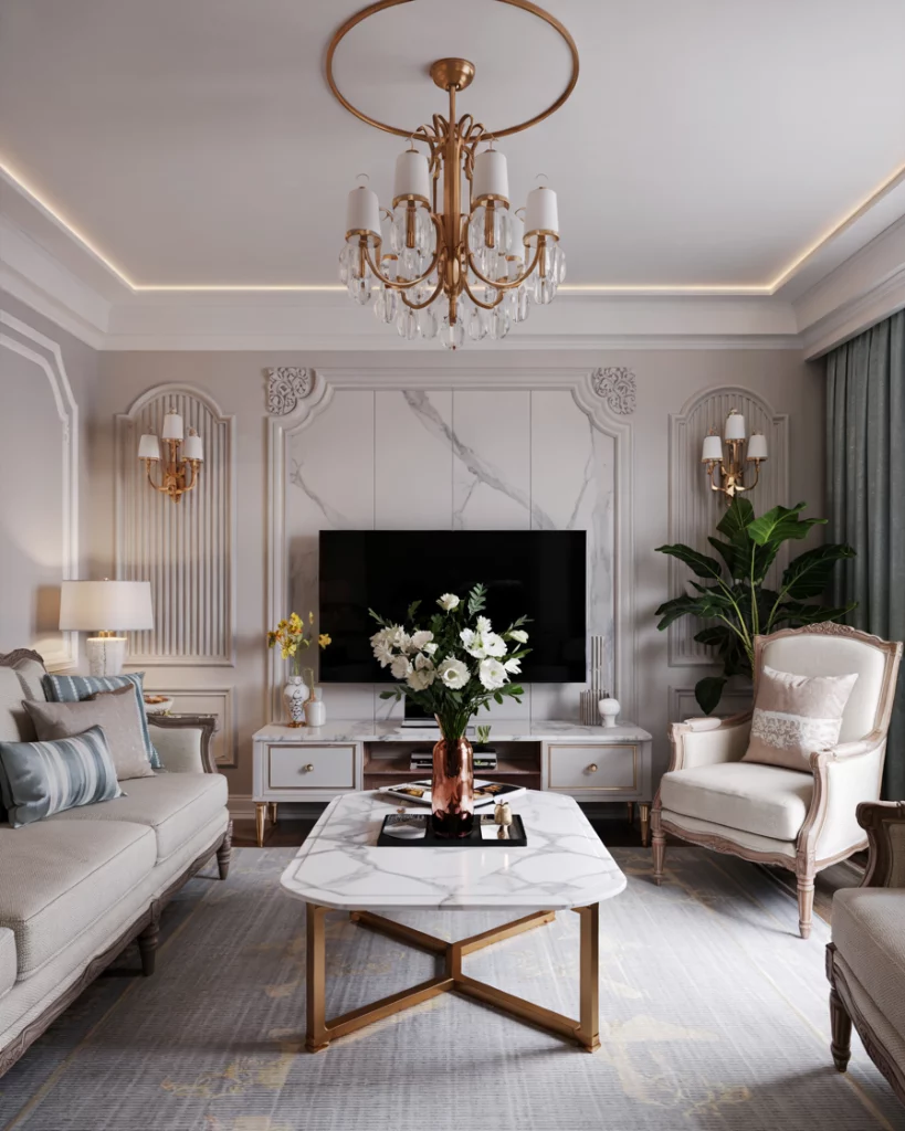 In neoclassic interiors, there is an upgraded version in softer shades—dark gray, ivory, champagne—in something softer and more subtle in color schemes and materials. The walls can be panelled, there can be sculpted light fixtures, and the sofa can be in light gray to perfectly subscribe to the elegancy in living room decor in neoclassic interiors perfectly in smaller apartments with modern tv wall or minimalist fireplace in compliance with the interior.
