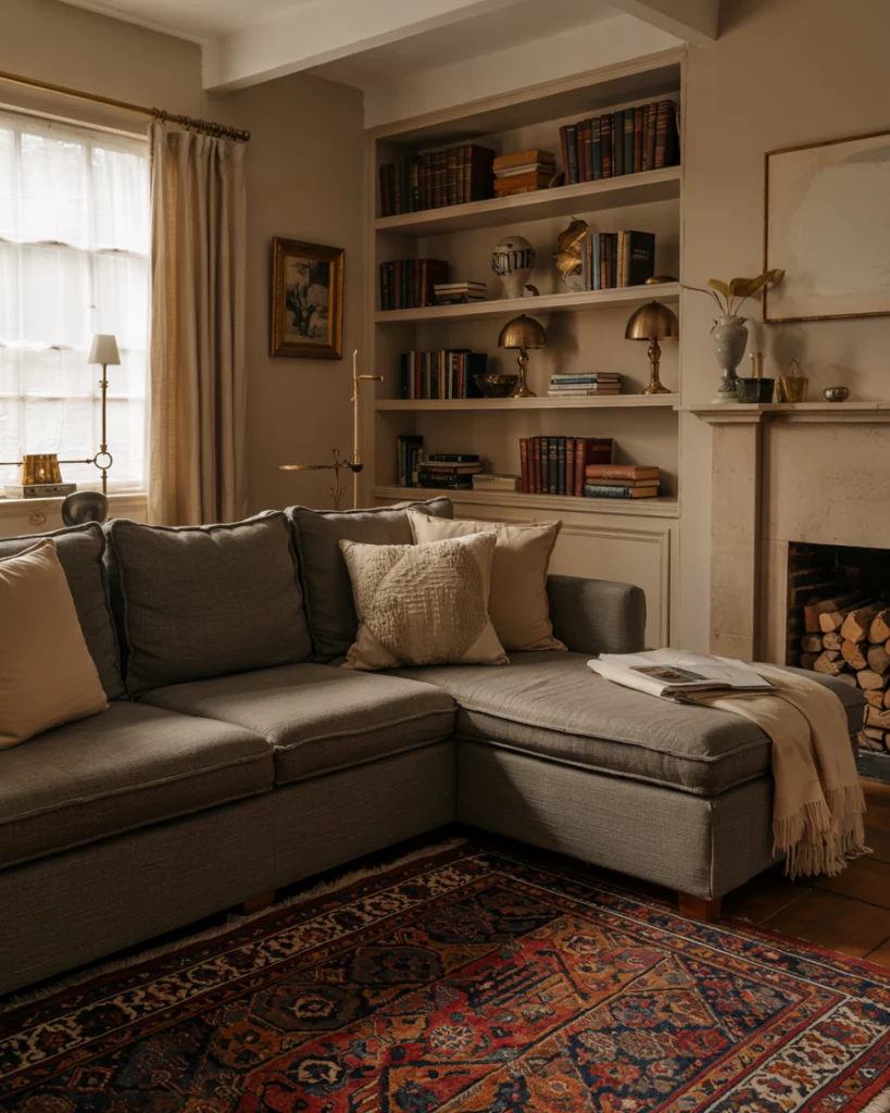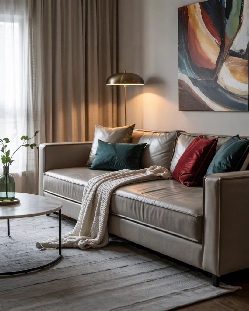 The trend of stepping beyond safe neutrals is strongly present in 2026 design conversations: richer neutrals and deeper tones are replacing pale greige. ELLE Decor Using a grey couch as an anchor, you can surround it with layers of jewel-tone cushions, textured throws, and bold accent pieces to create a look that blends luxury, colorful vibrancy and timeless sophistication. This approach suits larger living rooms—or small spaces apartment decorating ideas when executed with smart accessories and pared-down furniture.