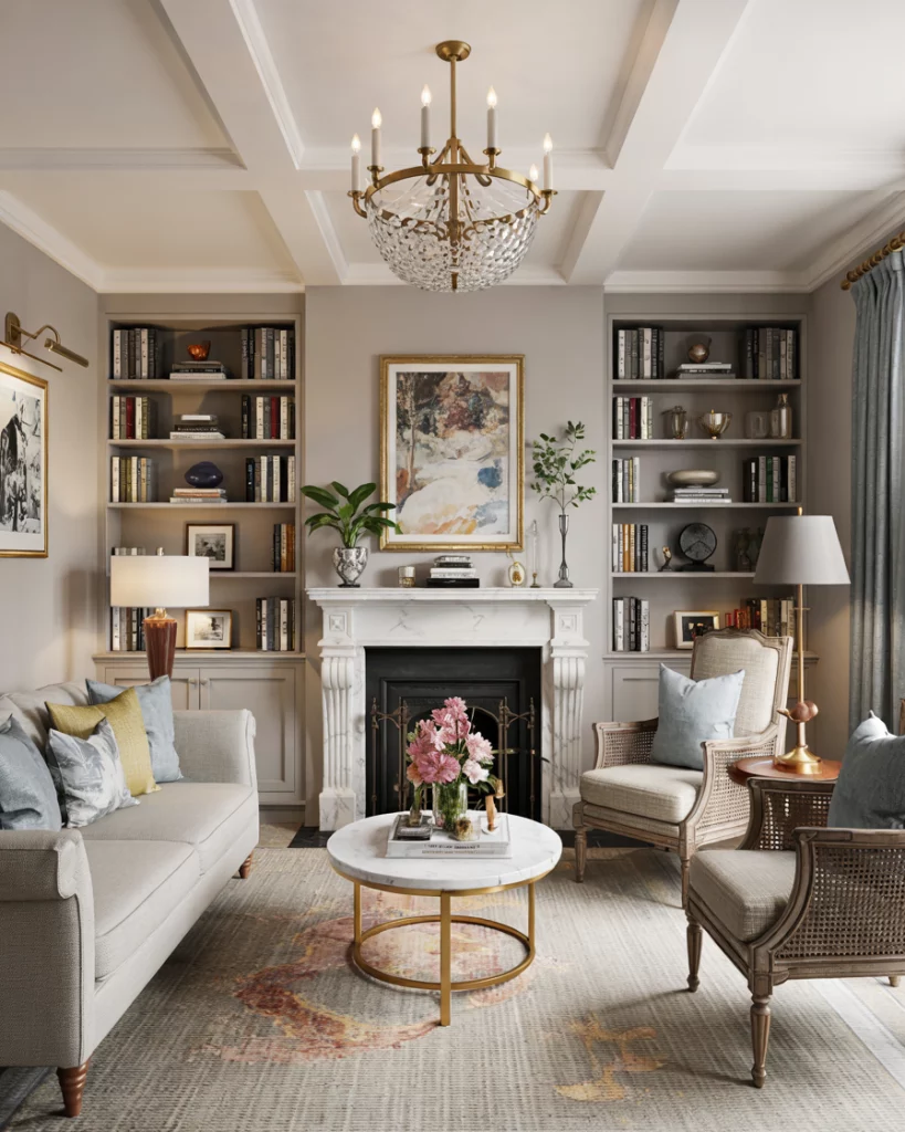Neoclassic revival encompasses “symmetry in architecture, high ceilings, and ornate details—but with minimal and modern materials.” The room has “marble fireplace, soft gray textures, and brass/gold accents.” The room has “elegant yet subtle” ambiance because it combines “classical elements with modernity.” “This understated yet sophisticated take on tradition is expected to continue in homes in 2026.”