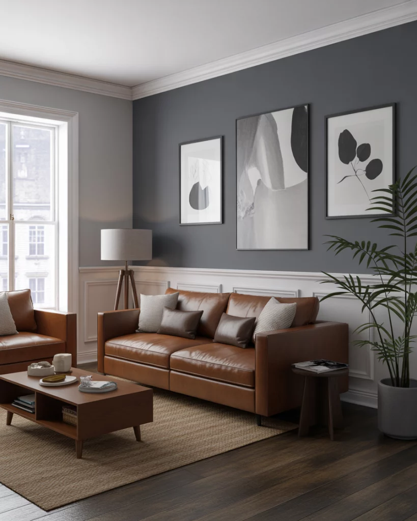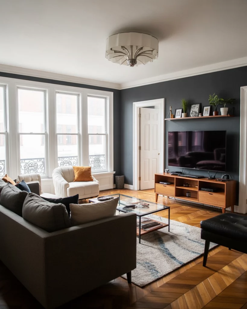 If you have dark furniture sofas, a bold accent wall is the perfect way to frame the room. Rich colors—like deep navy, charcoal, or even sherwin greens—make dark seating pop without feeling heavy. Add light brown wood floors for balance, and you’ll have a design that feels intentional and stylish.