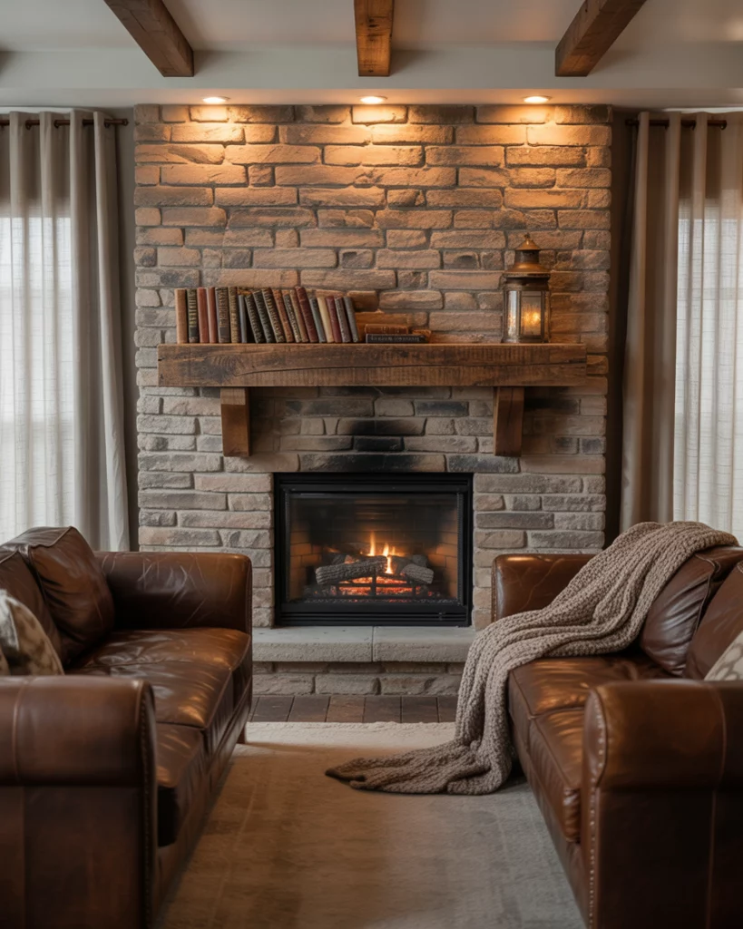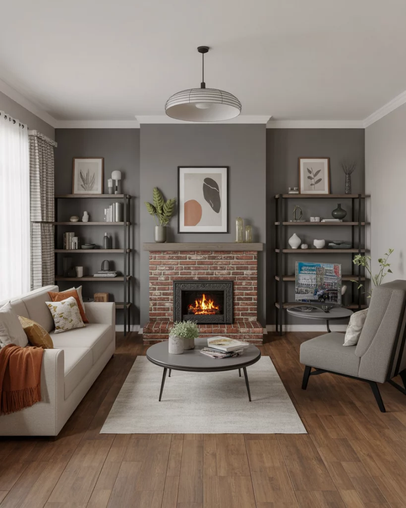 Nothing feels cozier than a grey accent wall brick fireplaces combo. The neutral grey balances the rustic charm of a red brick fireplace, creating a modern yet timeless effect. This pairing works especially well with light brown wood floors and neutral textiles, making it a warm gathering spot for any family.