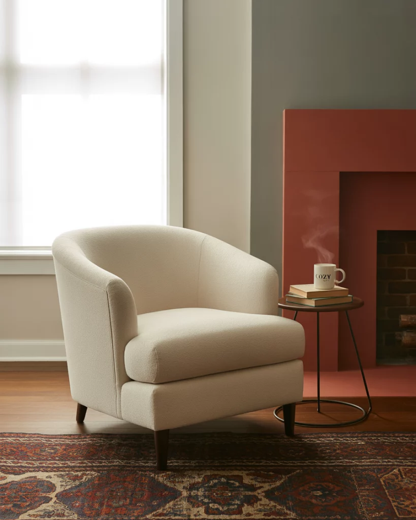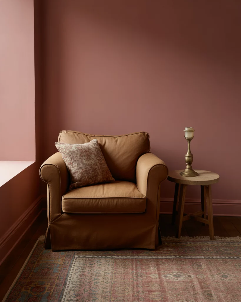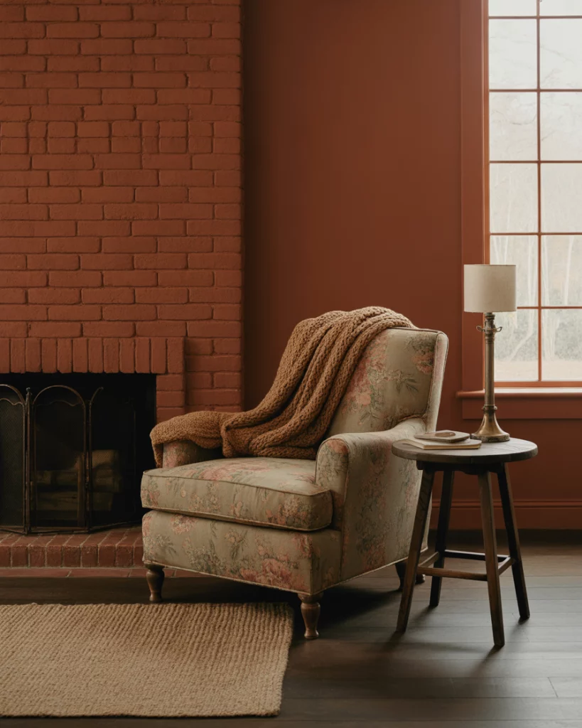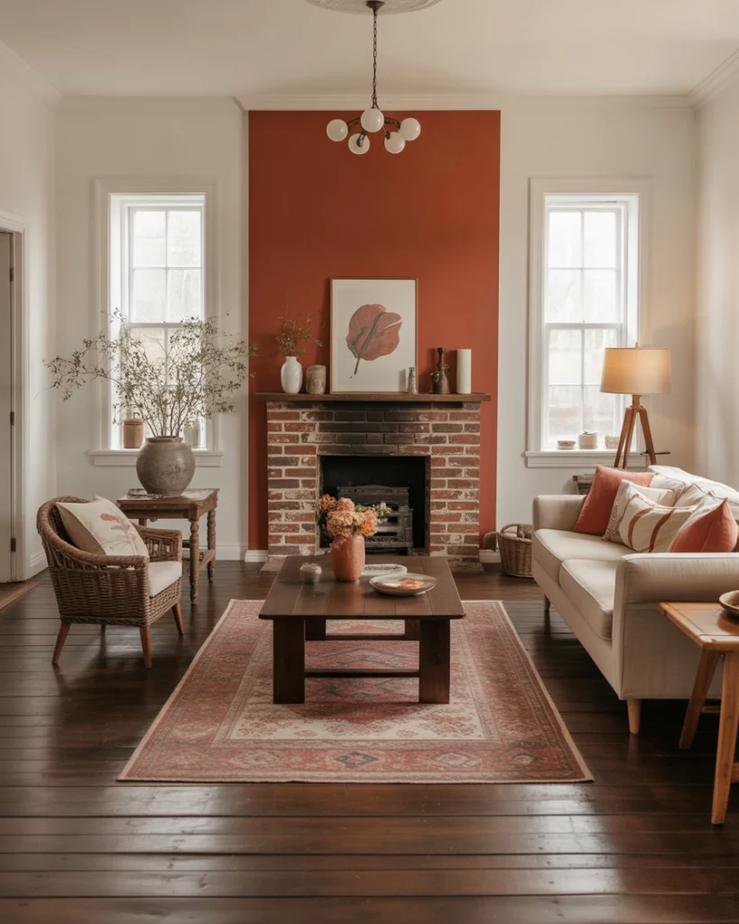 Terracotta tones reflect the earthy warmth of clay, which is making a strong comeback in 2026. On an accent wall, these hues radiate a welcoming feel, especially alongside a red brick fireplace or rustic beams. Inspired by Mediterranean and farmhouse aesthetics, terracotta works best with dark wood floor and soft cream accessories.