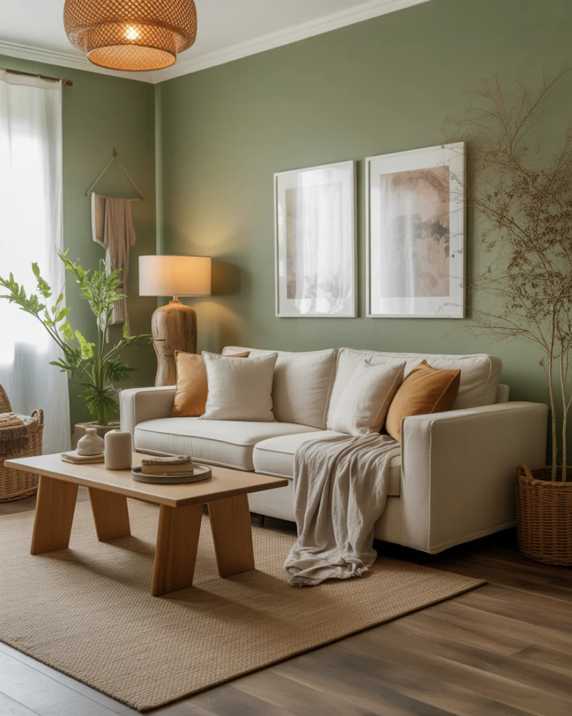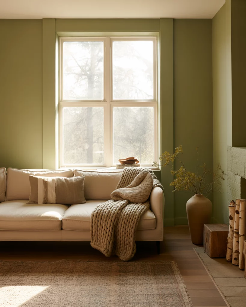 A muted sage green will be one of 2026’s go-to tones for creating a balanced and peaceful living room. It works beautifully on an accent wall or even across all four walls to bring the outdoors inside. Paired with neutral textiles and light brown wood floors, sage green offers both freshness and coziness. Designers often recommend pairing it with natural textures like linen and jute for an inviting look.